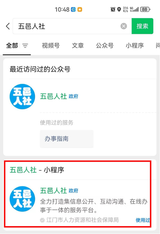 第一步:在微信搜索栏输入“五邑人社”,点击选择“五邑人社”小程序。
