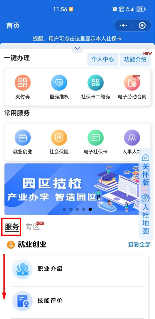 第二步:进入“五邑人社”小程序初始界面,点选“服务”栏目,下拉页面。