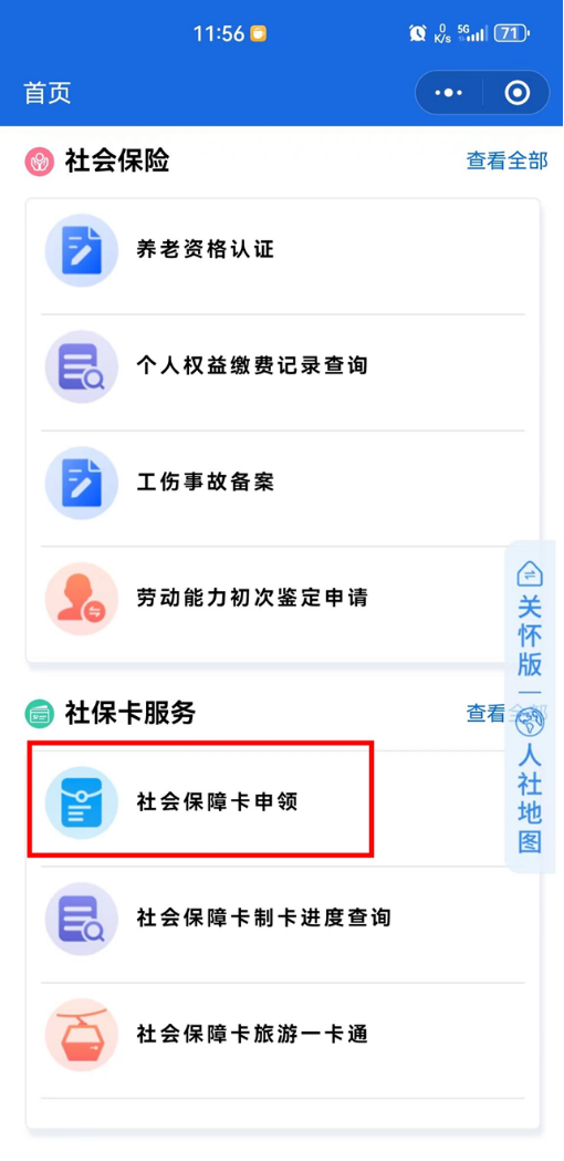 第三步:找到“社保卡服务”栏目,点击选择“社会保障卡申领”选项。