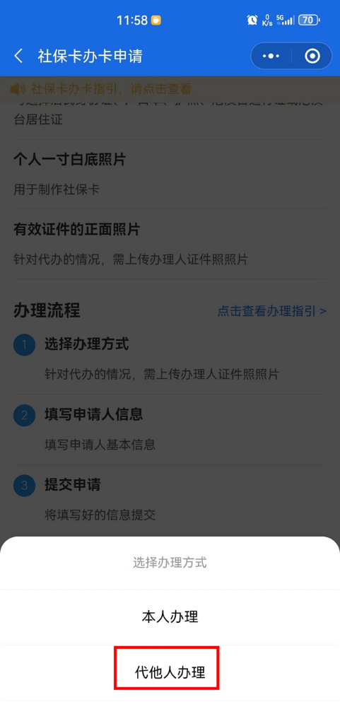 第五步:根据需求情况选择办理方式,如家长为学生申请办卡的请选择“代他人办理”。