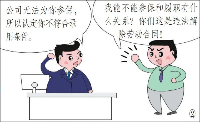 刘先生觉得,史某肯定是在社保问题上有“猫腻”导致公司无法为他参保,于是在请示公司总经理后,以不符合录用条件为由与尚在试用期内的史某解除劳动合同。史某不同意,说录用条件只能和履职相关,而参保缴费和履职无关,公司不能因无法为自己参保就认定自己不符合录用条件;如果公司不想被告,要么让自己留下,参保缴费的事慢慢谈,要么给点补偿,自己可以痛快走人。听了史某的条件,刘先生也不确定,公司解除劳动合同会不会真的违法。