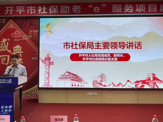 中国人寿开平支公司总经理张又天,总经理协理汤俊杰分别作了讲话,对“社保助老e服务”项目进行详细介绍,围绕“养老待遇资格认证”及“老年人智能手机使用教导”等服务内容展开讲解。最后,开平市社保局、开平国寿领导班子进行“社保助老e服务”项目启动仪式。