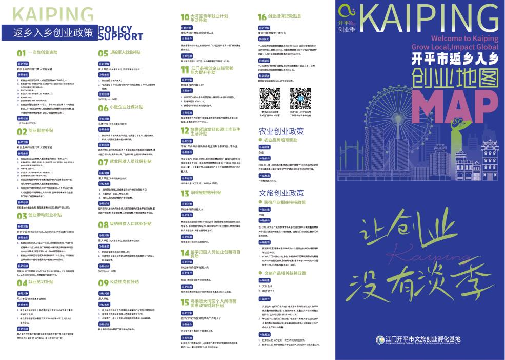 本次创业周是开平推动创业工作的一个生动缩影,也是探索吸引人才返乡入乡创业的重要成果。近年来,开平市扎实开展整县推进农文旅融合发展试点工作,激活5A世遗碉楼景区和赤坎华侨古镇双引擎,吸引一大批有志青年和返乡人才投身乡村,发展民宿、文创、书店、咖啡店等新兴业态,为乡村注入新活力,助力实施“百县千镇万村高质量发展工程”。开平打造返乡入乡创业大礼包政策保障,涵盖一次性创业资助补贴、创业租金补贴、创业担保贷款、农业品牌培育奖励、民宿产业和文创产品方面扶持等政策,配套提供共享工位、人才公寓、人才饭堂等资源,全面优化创业就业环境,助力返乡创业者发展。此外,通过发挥“开创π”的平台优势,推行“总部+项目”模式,累计吸引70个创业团队进驻,辐射带动开平市相关产业就业人数超2万人,真正实现“以点带面、全域开花”。