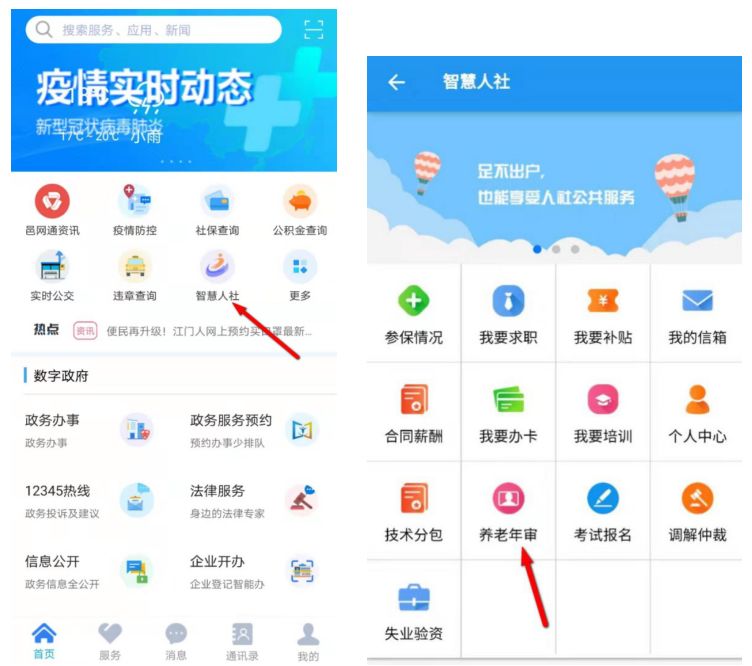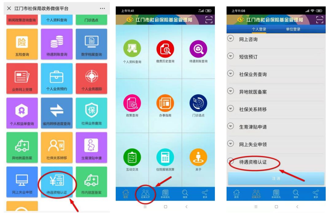 资格认证指引:进入“江门社保”微信公众号-点击 “社保服务”-进入“社保查询预约平台”-点击“待遇资格认证”-按提示扫描下载江门社保app-登录(输入身份证号码、密码:初始888888、社保卡金融账户后6位数)-点击“待遇资格认证”-上传身份证正反面-然后视频拍照-点击“上传”。