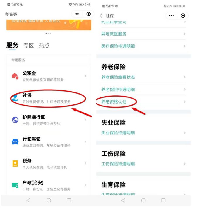 1.可办理:企业职工养老保险待遇资格认证(即退休年审)业务。2.操作指引:参保人通过智能手机在微信上搜索“粤省事”小程序-在服务专区选择“社保”板块-点击“登录”,通过个人身份认证后,选择“养老保险”-点击“养老资格认证”-点击“城镇职工社保”-点击“本人办理”或“为他人代办”,并输入对应的姓名和身份证号码-进行人脸识别认证。