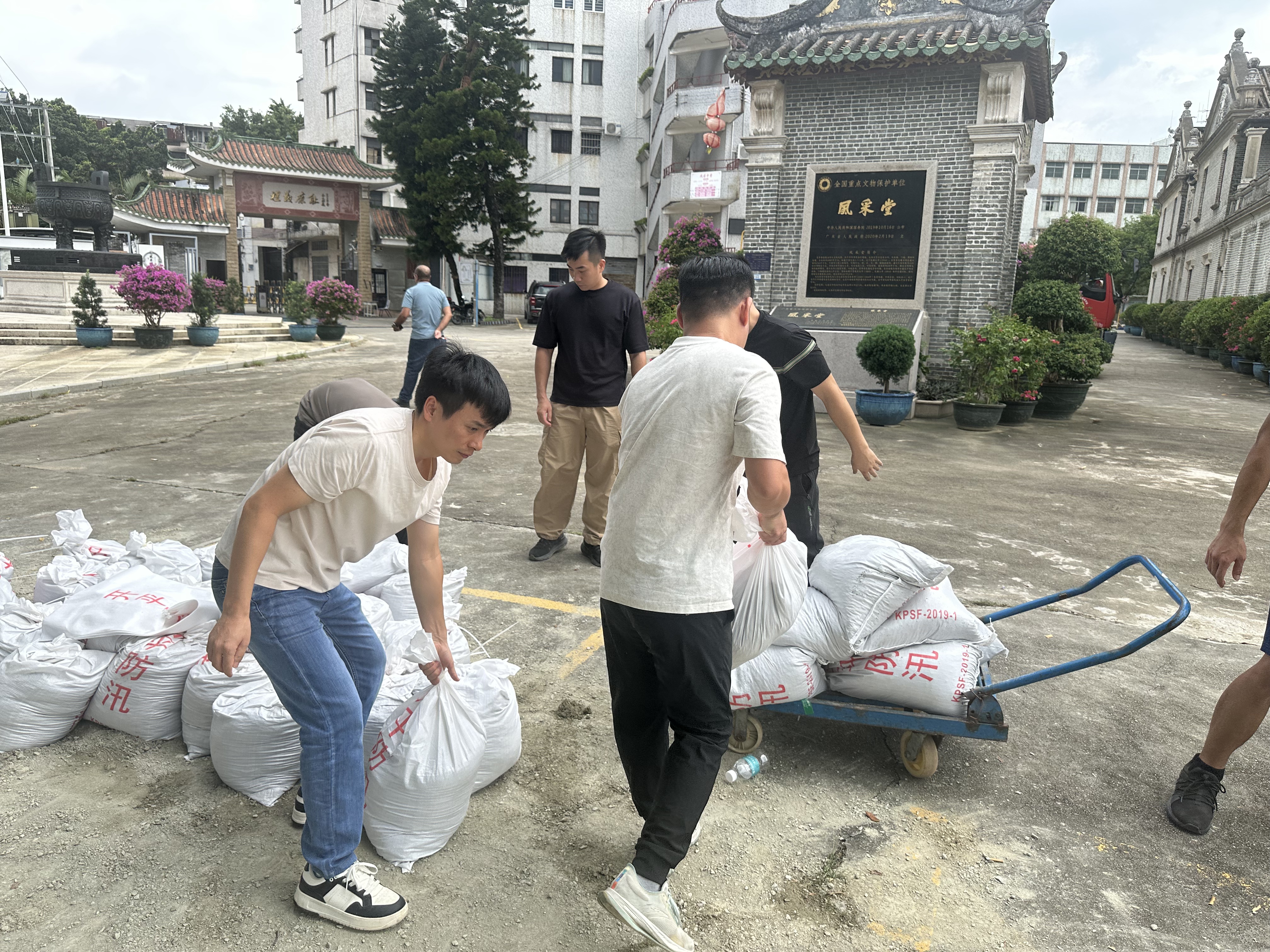 开平市水利局组织工作人员协助风采中学对学校护岸较低或镂空处采用沙袋进行封堵加高