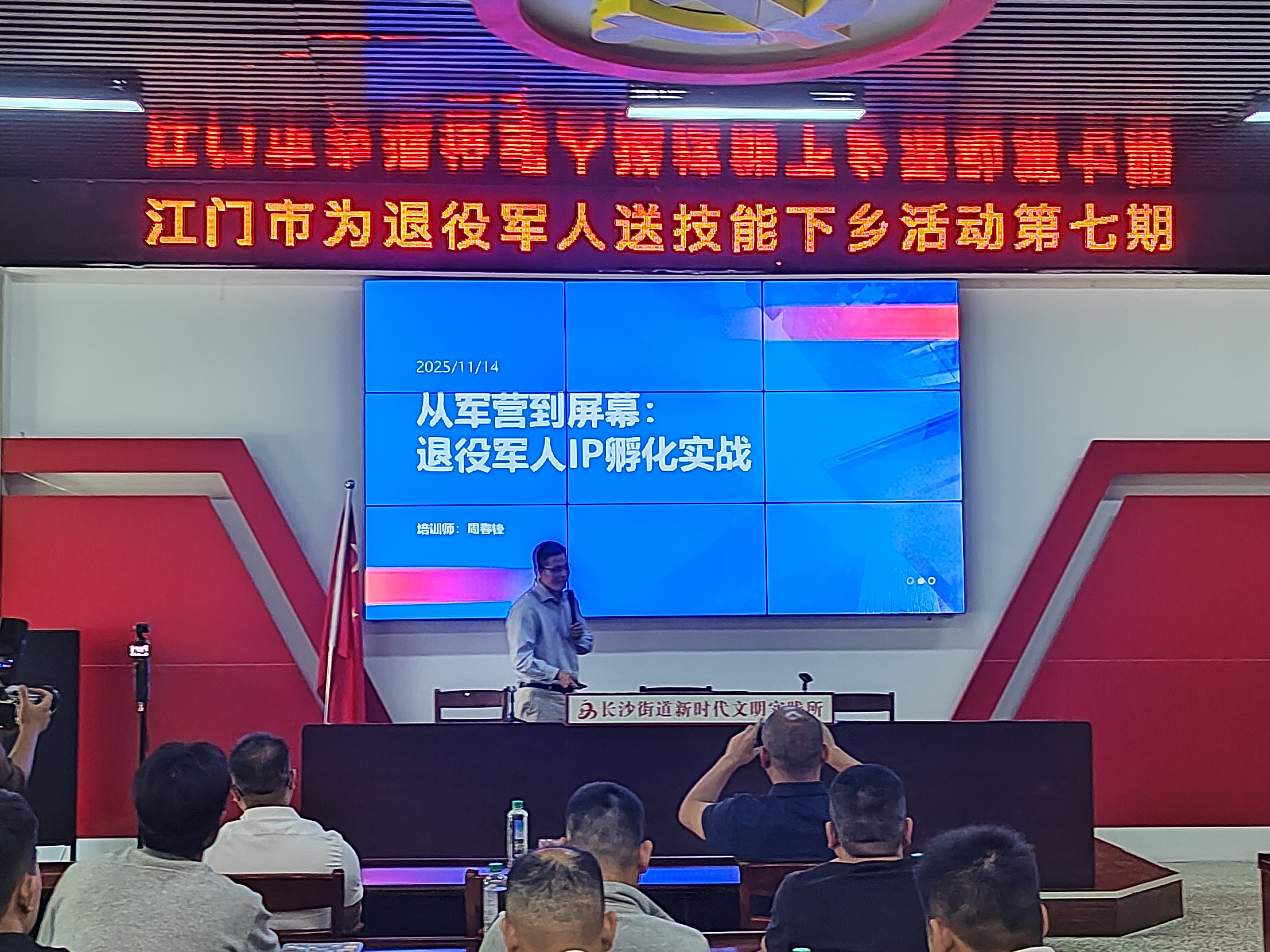 为助力退役军人紧跟数字经济浪潮,拓宽就业创业路径,11月14日, “送技能下乡”第七期(开平专场)活动在开平市长沙文体活动中心顺利举办。60余名退役军人齐聚一堂,沉浸式学习短视频创作与营销实用技能。