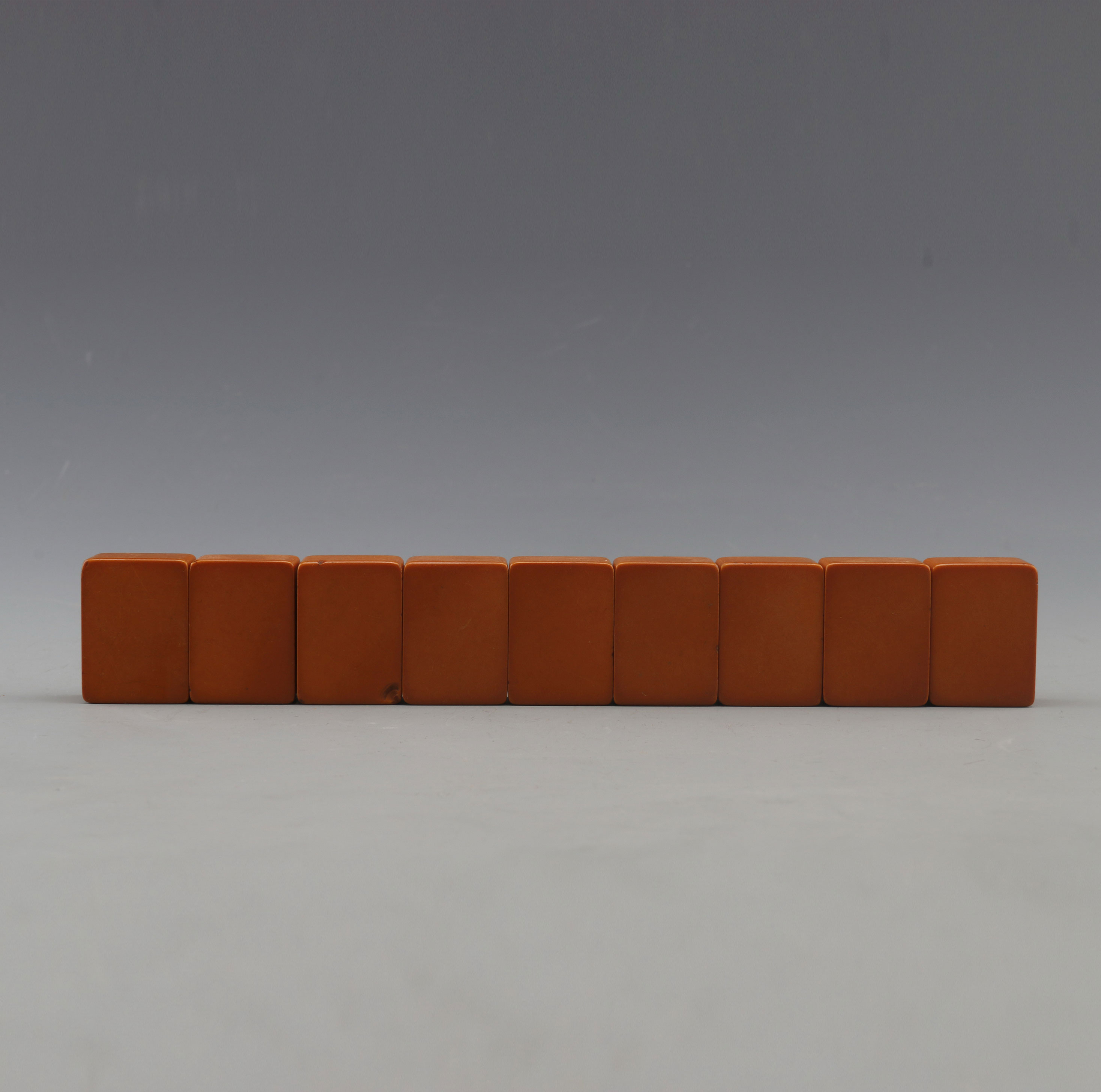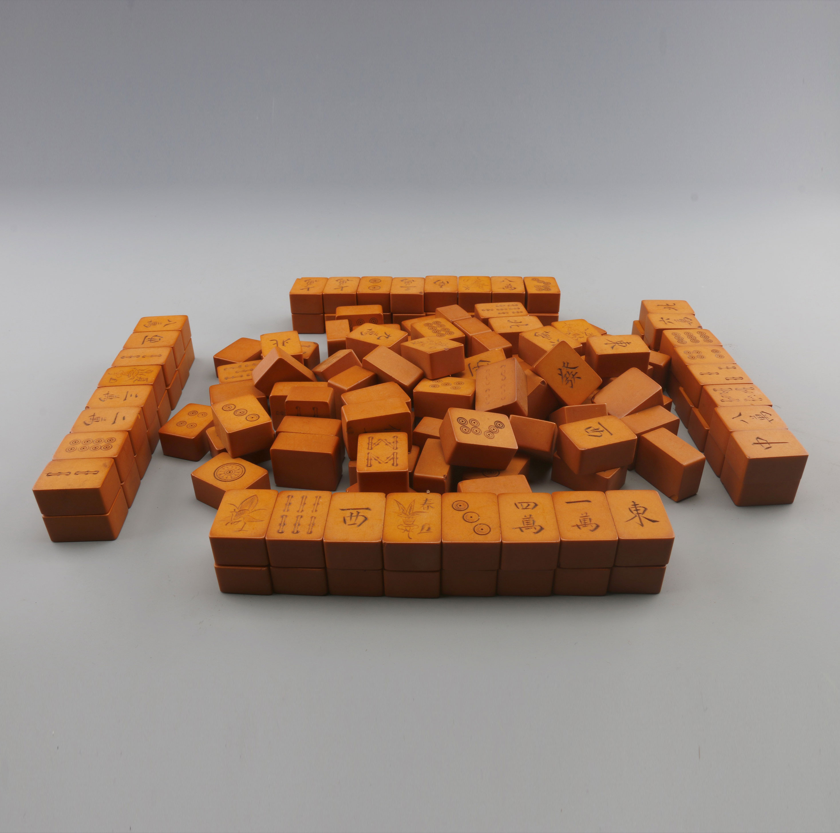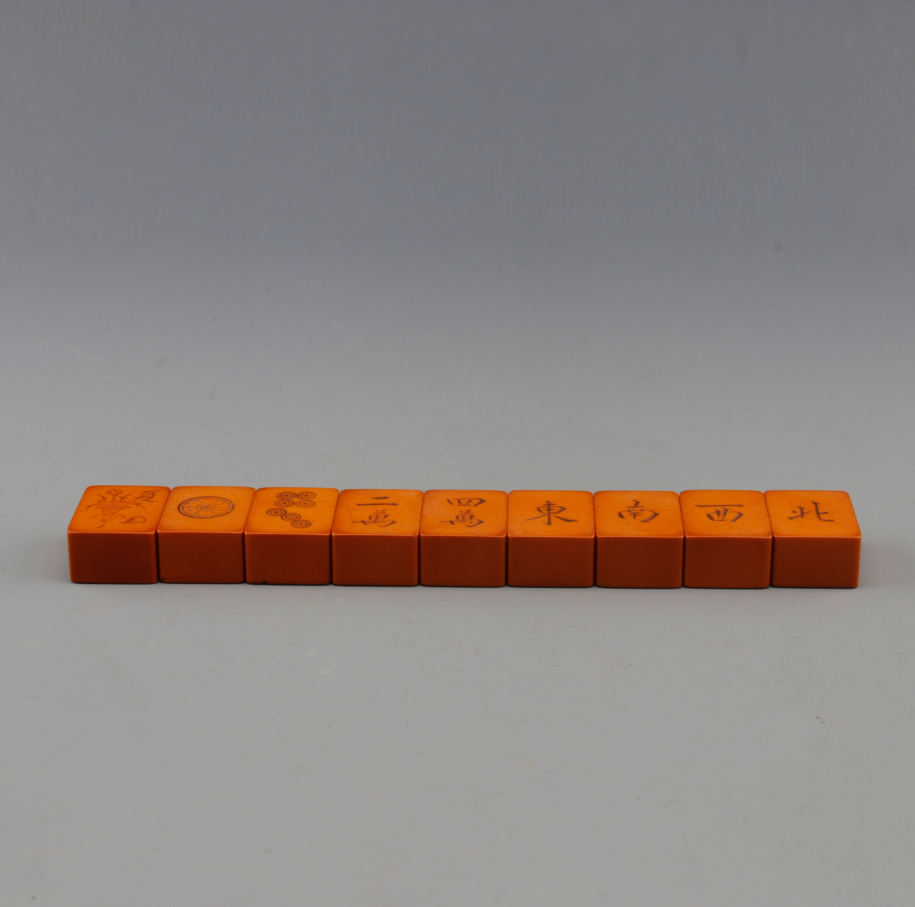 年代:中华民国;尺寸:每个牌长3cm ,宽2.2cm,厚1.4cm。为一副麻将牌,用牛骨制成,米黄色。每个牌作长方形,在一个宽面刻制麻将的番号和序号,制作精良。