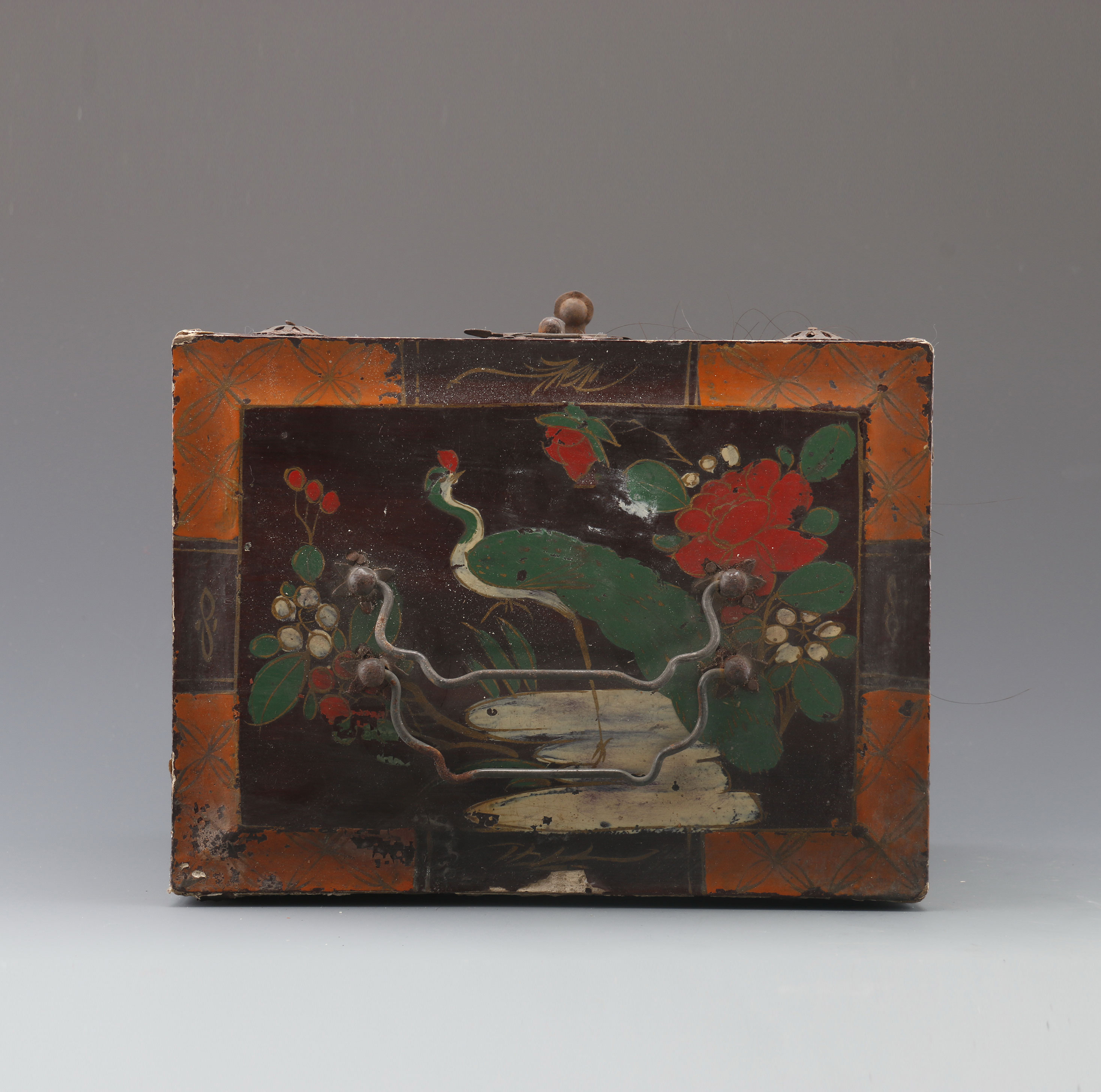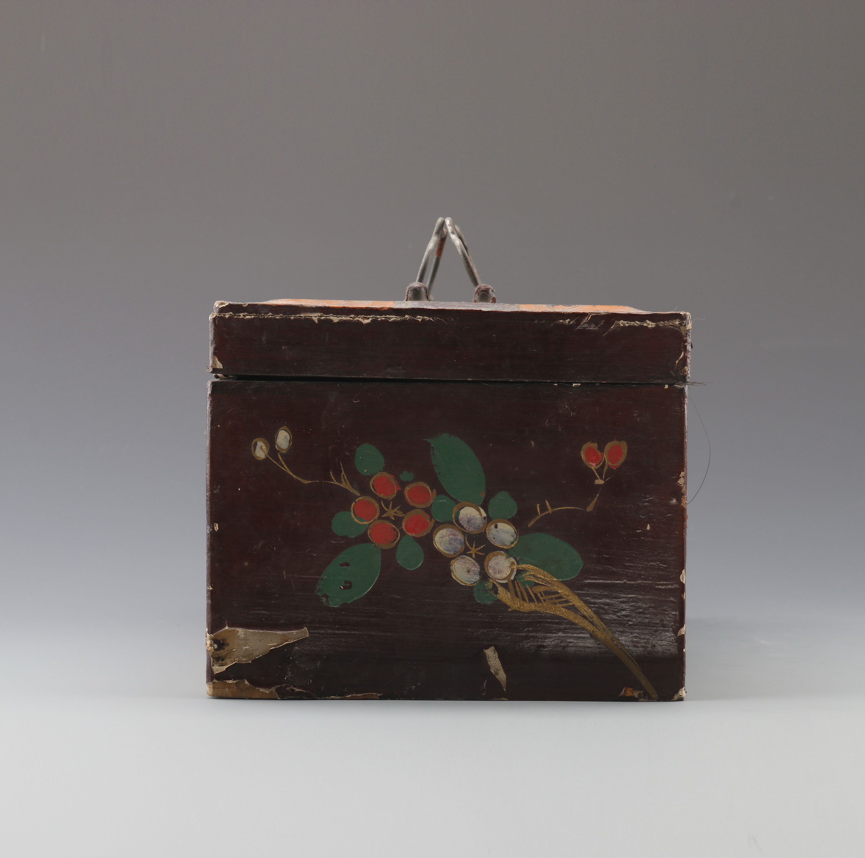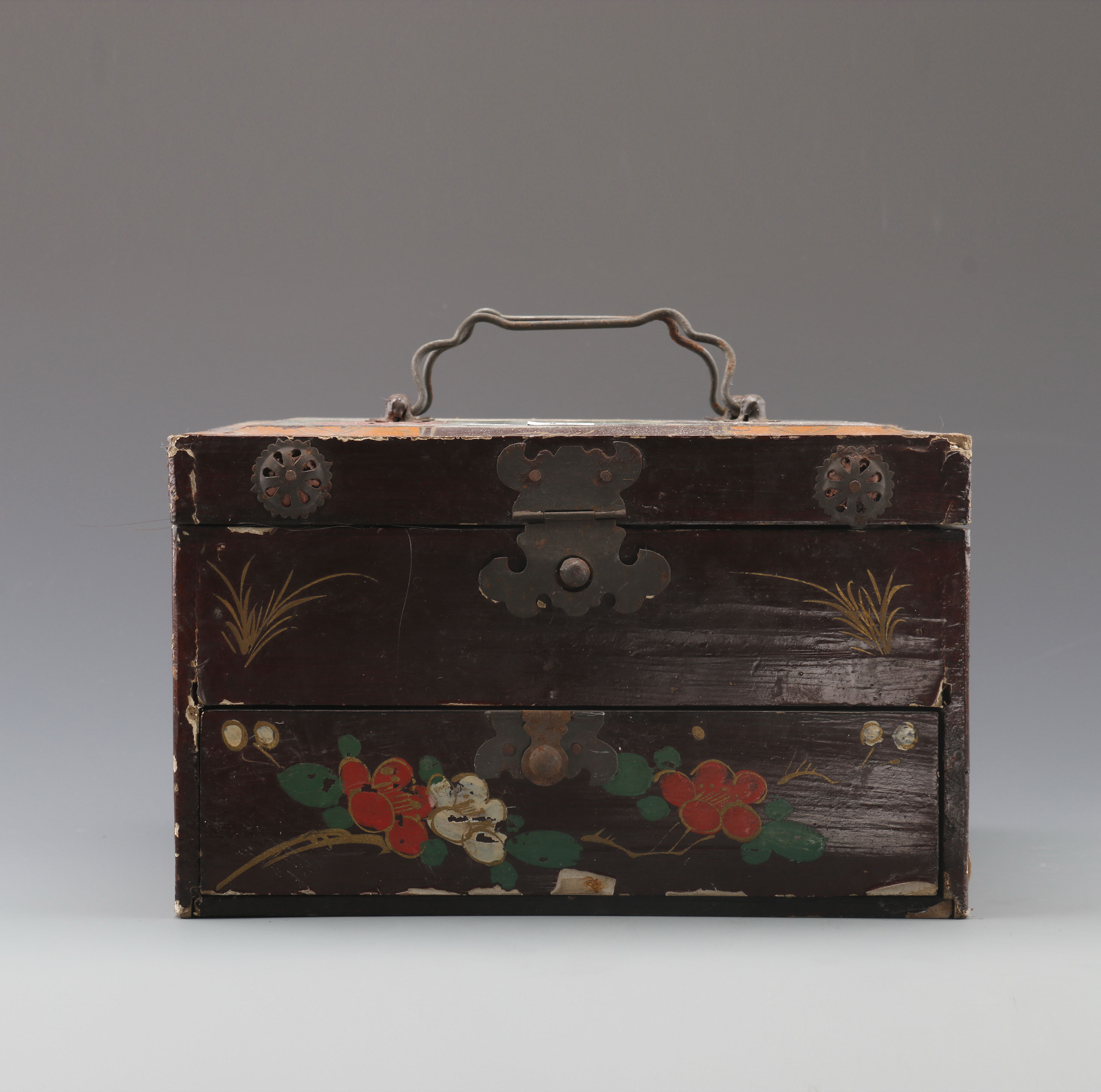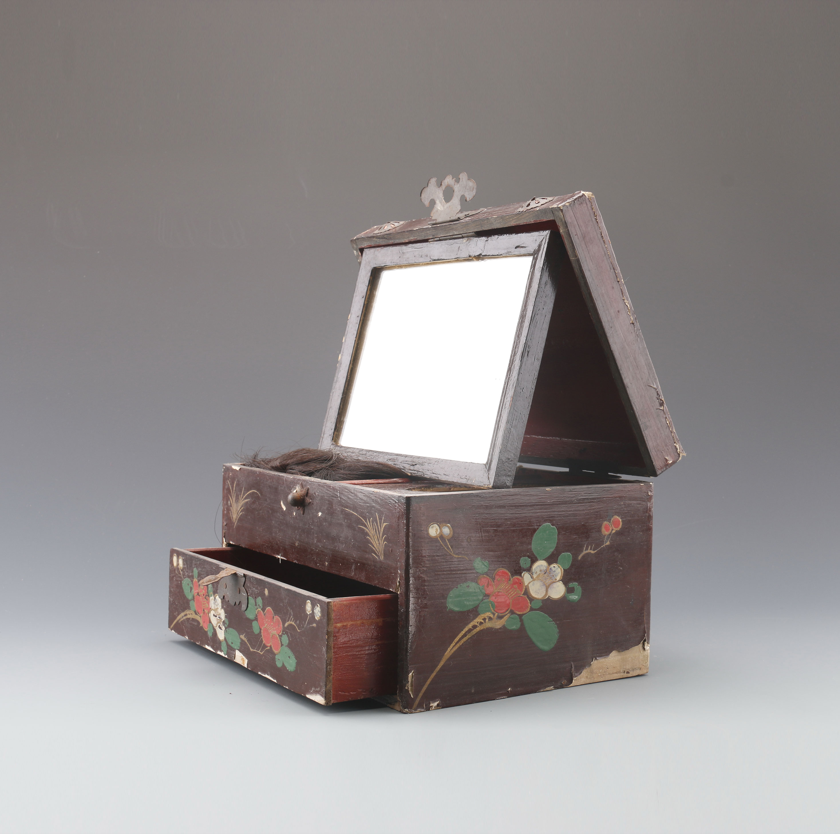 年代:中华民国;尺寸:长21.6cm,宽16.3cm,高13.7cm。长方形,两抽屉,上可打开并有玻璃镜。木质红漆,正面及两侧绘花卉。漆釉略脱。是当时开平有钱人家小姐用的梳妆饰盒。