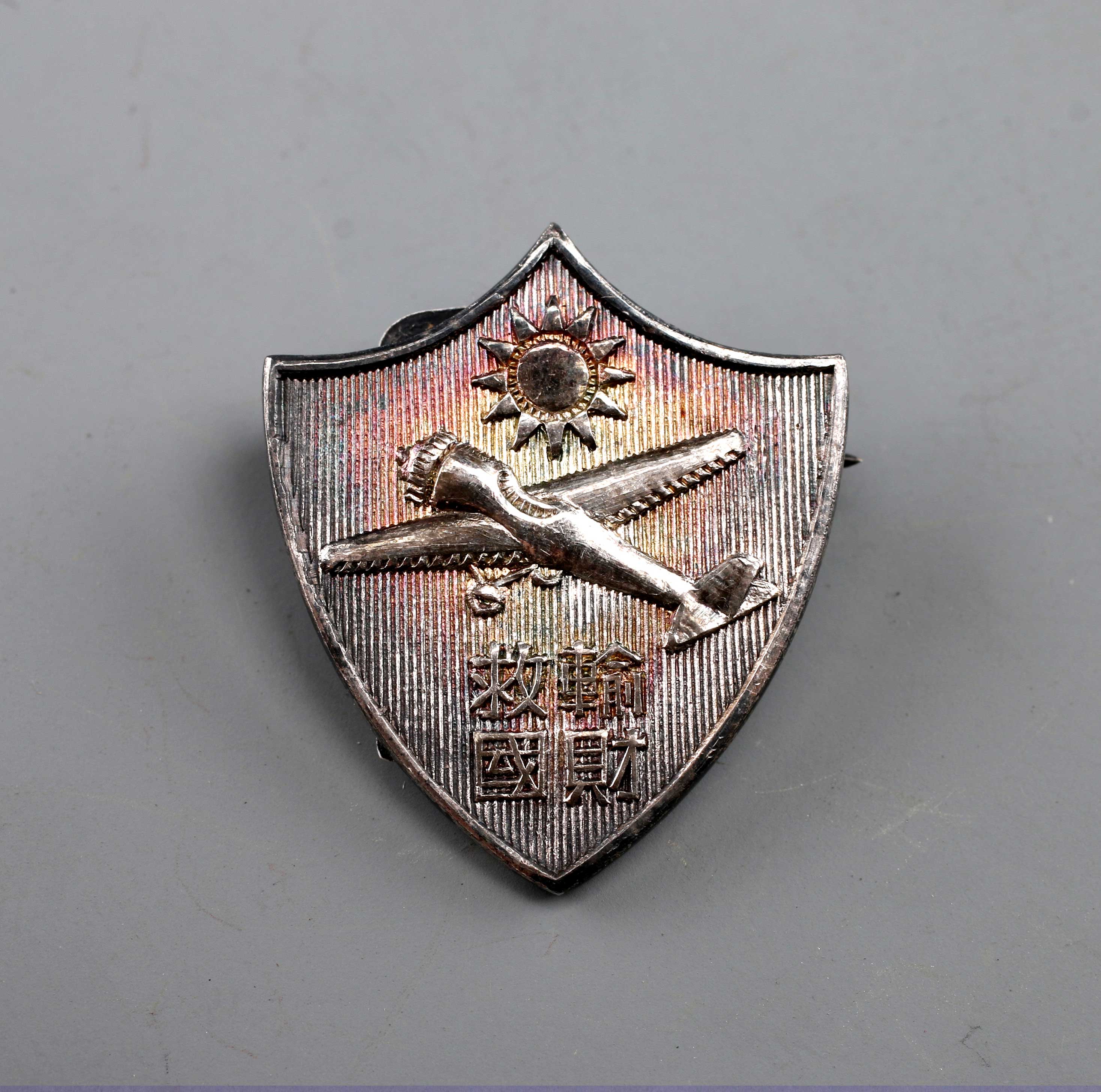 年代:中华民国二十八年;尺寸:长2.3cm,宽2cm,厚0.2cm。奖章上铸国民党党徽,中为一架飞机,下为“输财救国”字样。这是开平旅美华侨罗仪盈当时抗日捐款所得奖章。