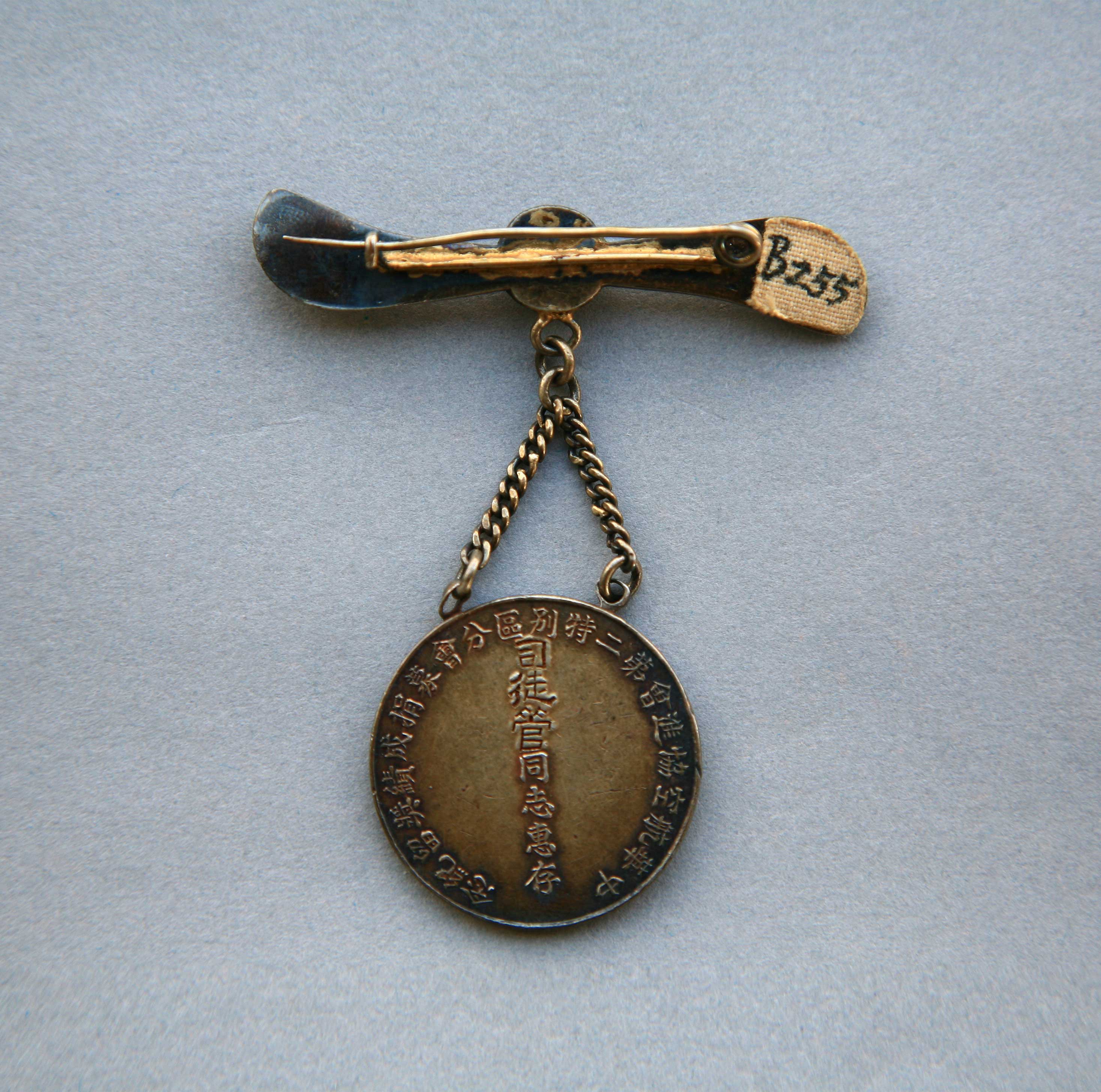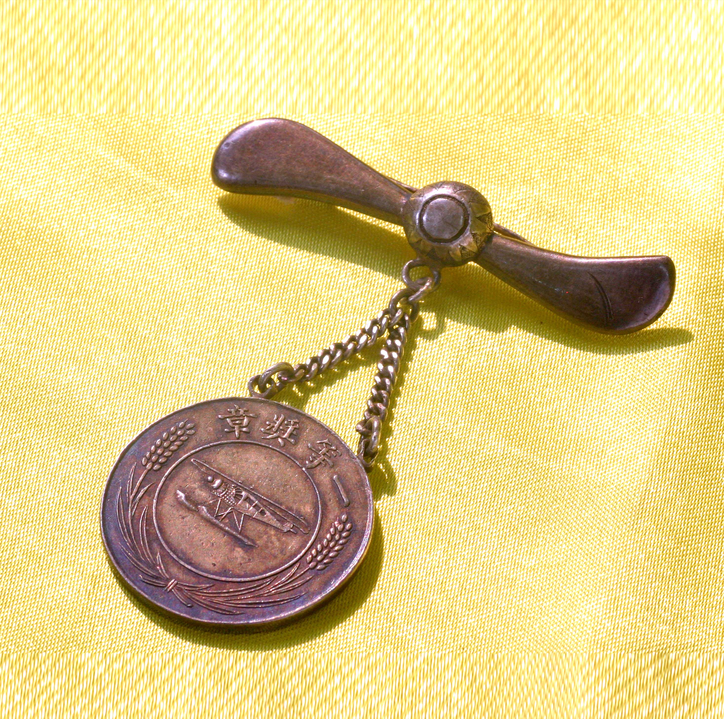 年代:中华民国;尺寸:通宽5.9cm,高6.6cm。奖章圆形,上有横杠及挂链。中央铸饰一架飞机,外圈上部为“一等奖章”,下面为稻穗。这是中华民国十二年(1923),开平赤坎旅澳爱国华侨司徒管受孙中山之托主办“中华航空协行会”,前往澳洲募集经费,购得一架名曰“广州”的飞机回国,孙中山为表彰他的功绩,特颁给“一等奖章”。