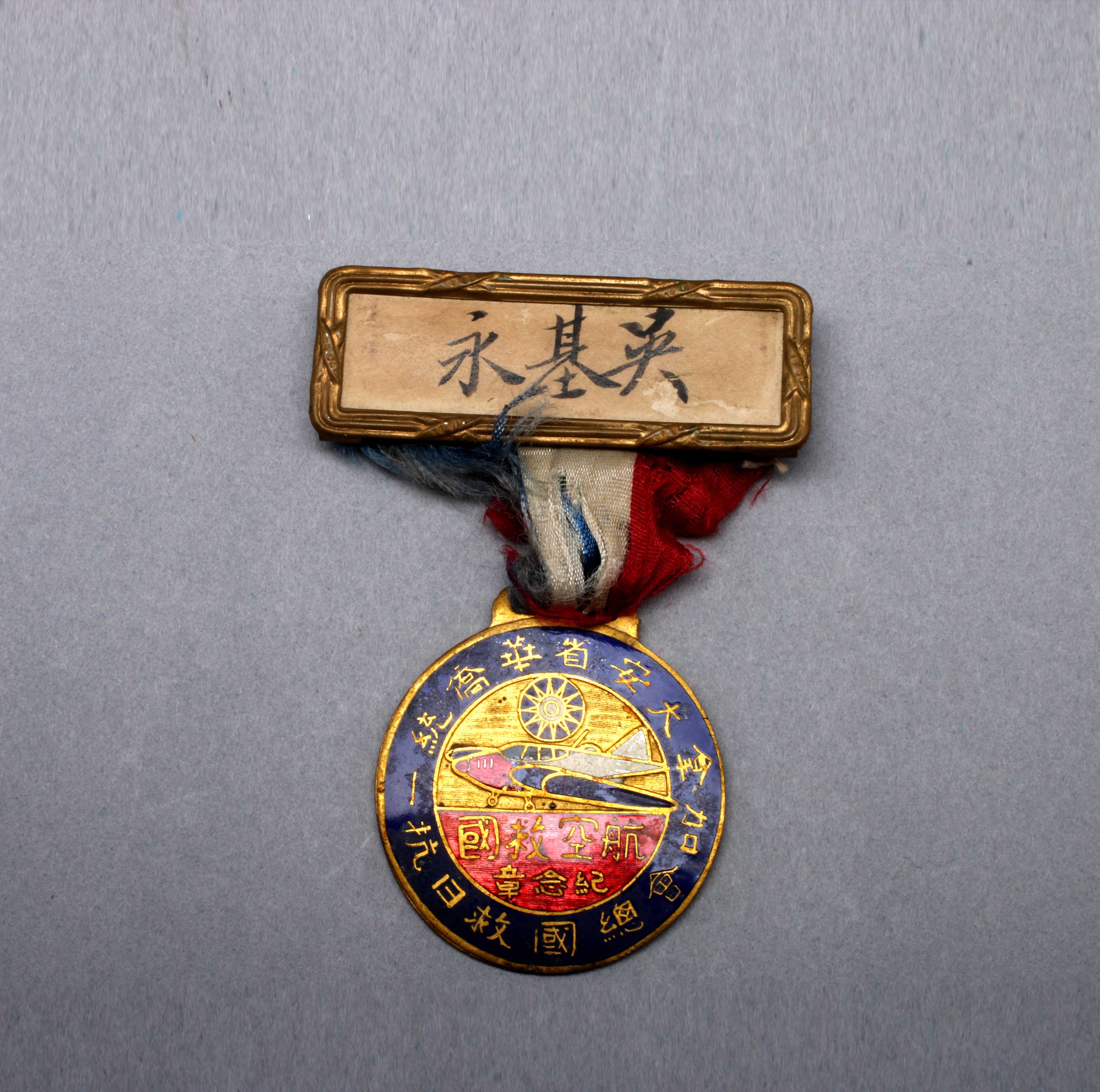 年代:20世纪上半叶;尺寸:长8.4cm,直径5.6cm,厚0.17cm。圆形。其上有吴永基的长方形名牌。中央为国民党党徽及一架飞机图案,并有“航空救国纪念章”字样,周边为“加拿大安省华侨统一抗日救国总会” 字样。这是开平长沙旅加华侨吴永基当时积极参加抗日活动而荣获的一枚纪念章。