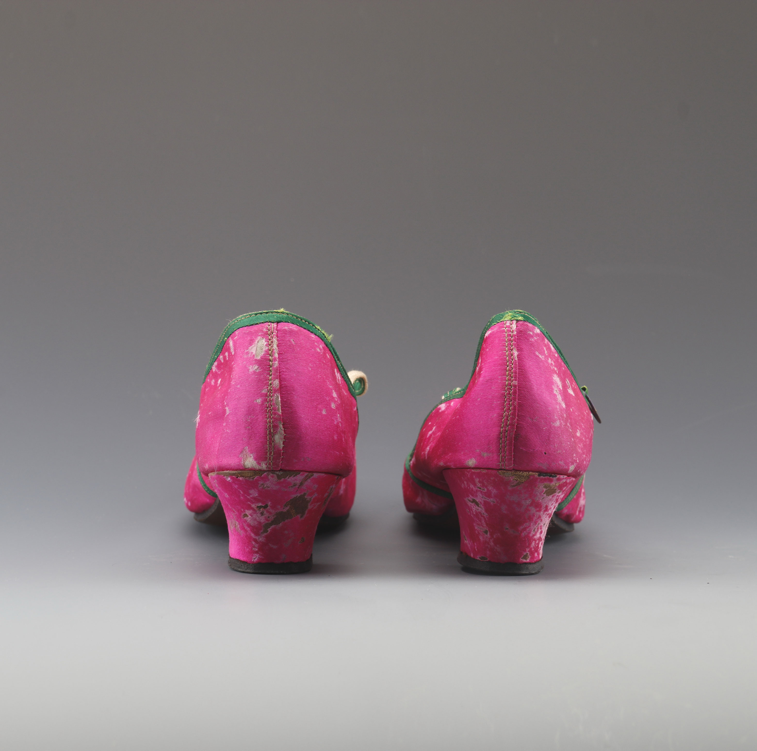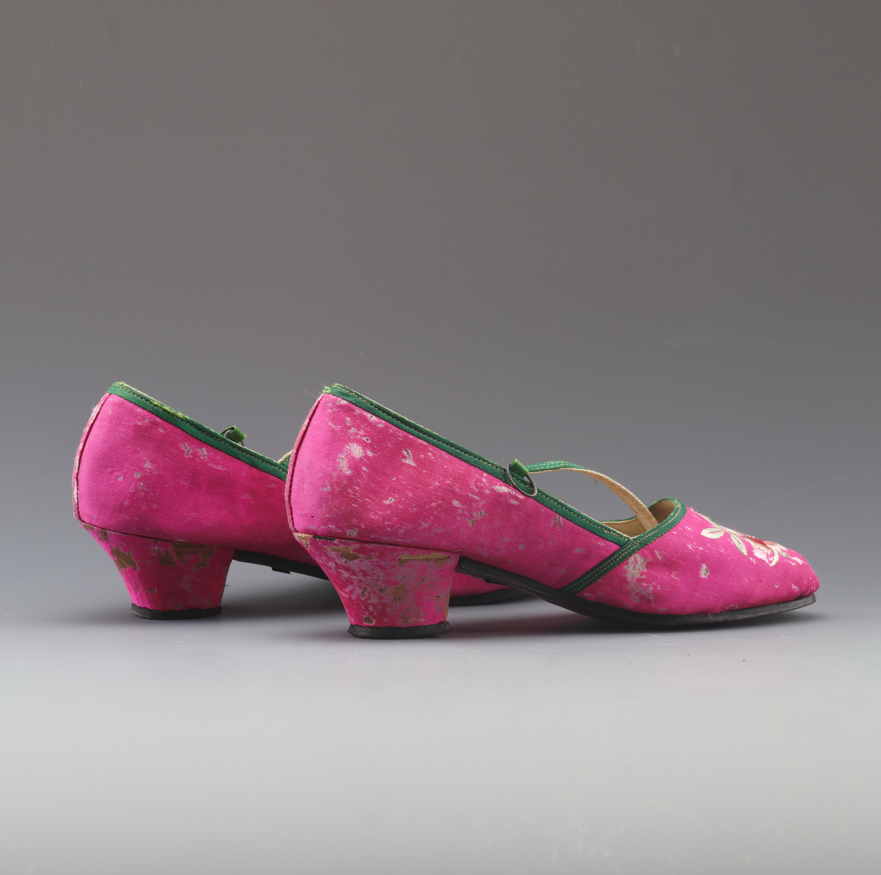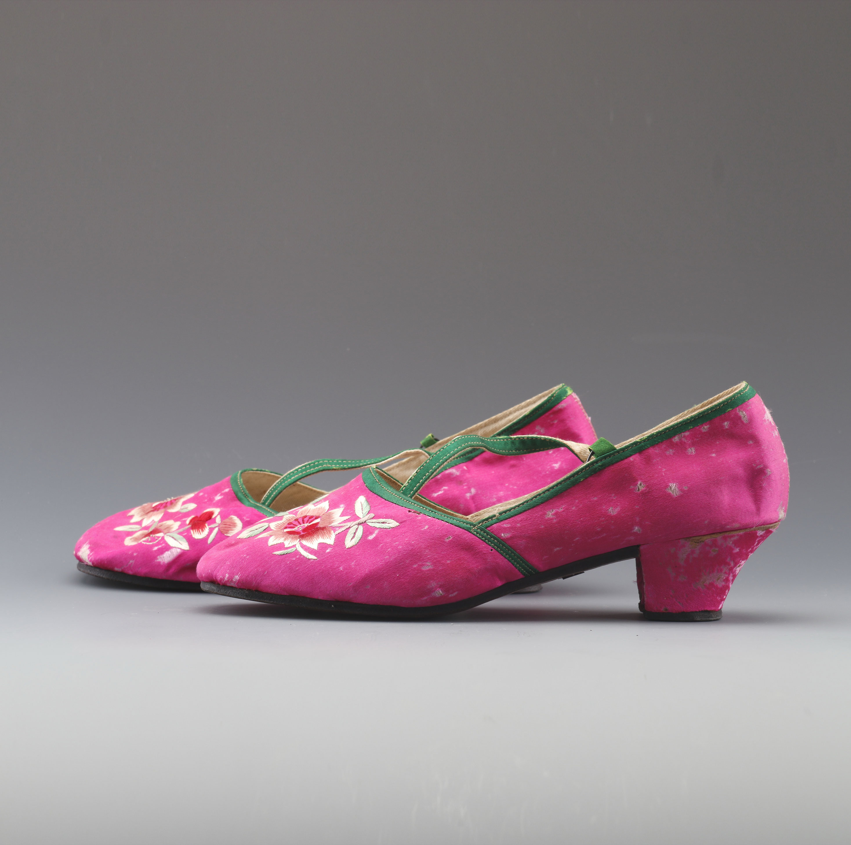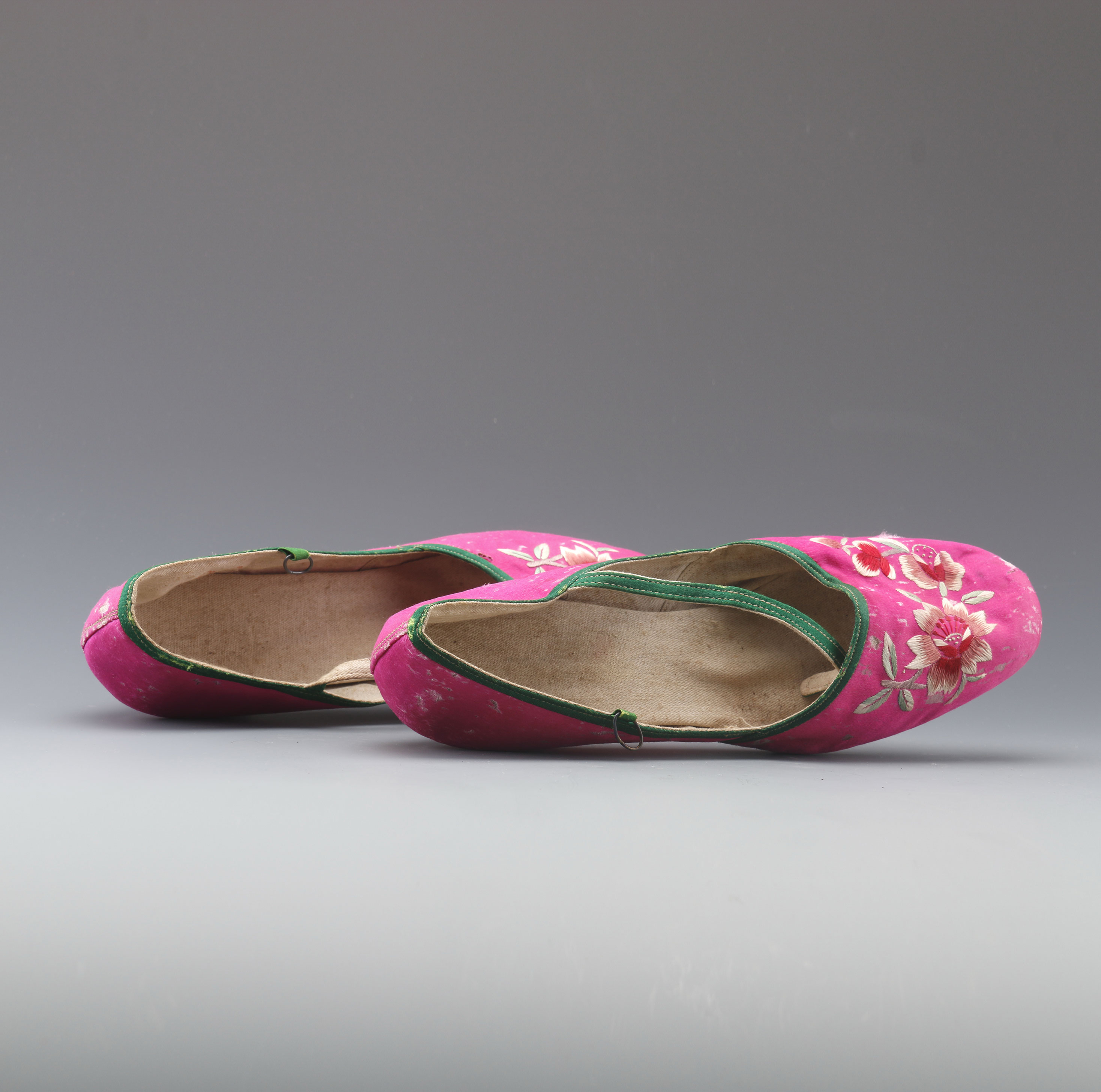 年代:中华民国;尺寸:长24.2cm,宽6.9cm,高9.3cm。一对。前有鞋面,绣花卉纹。后有包跟并带扣。是中华民国时期开平妇女所穿的绣花鞋。