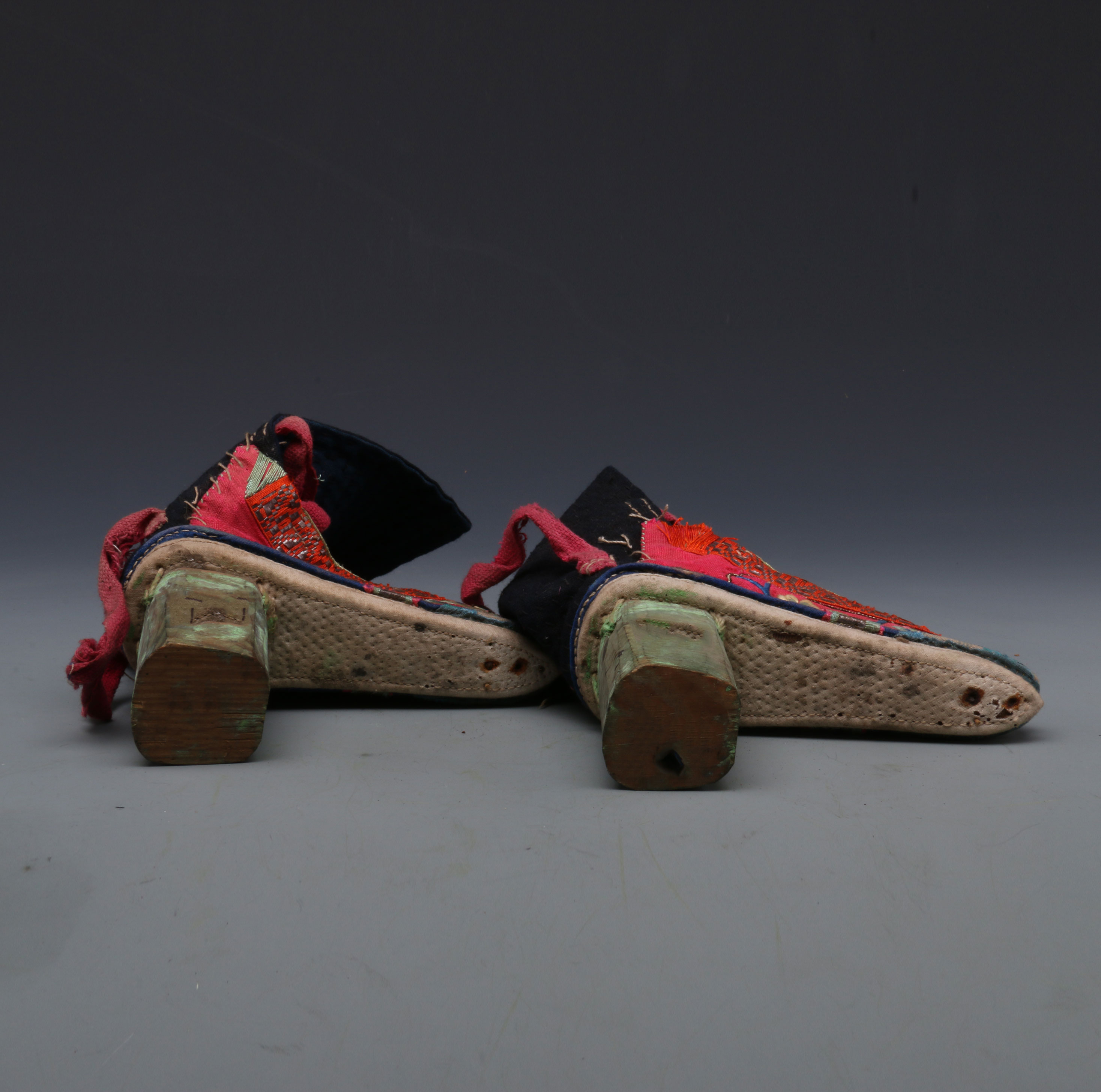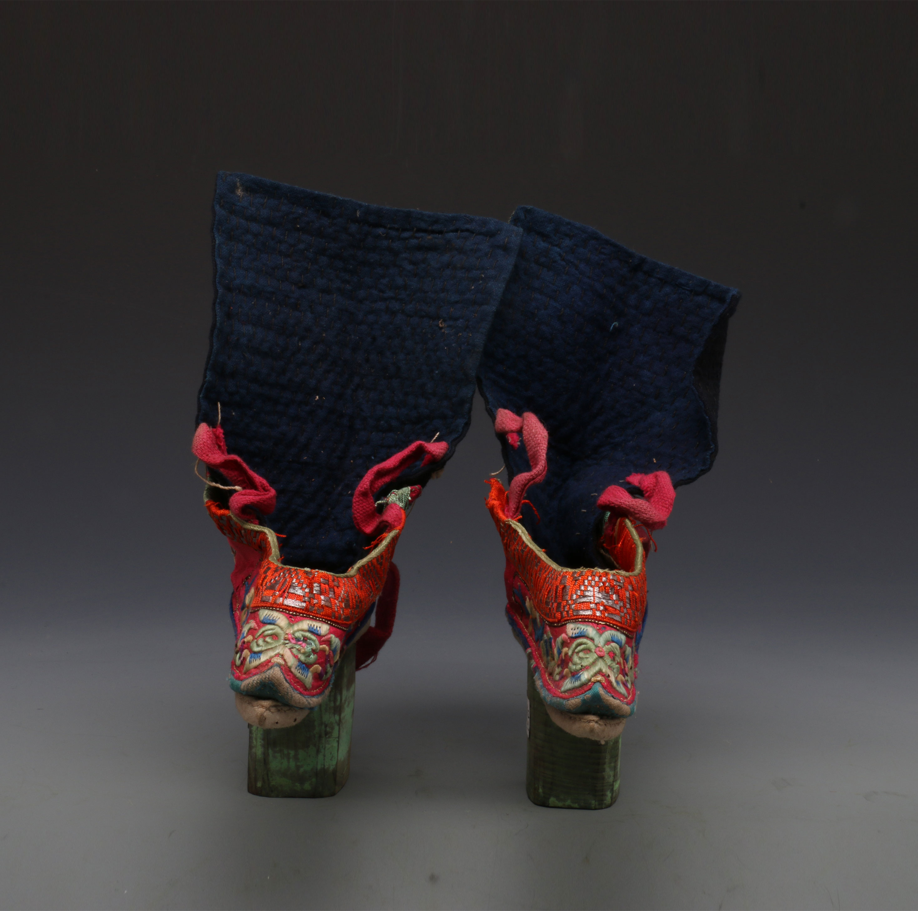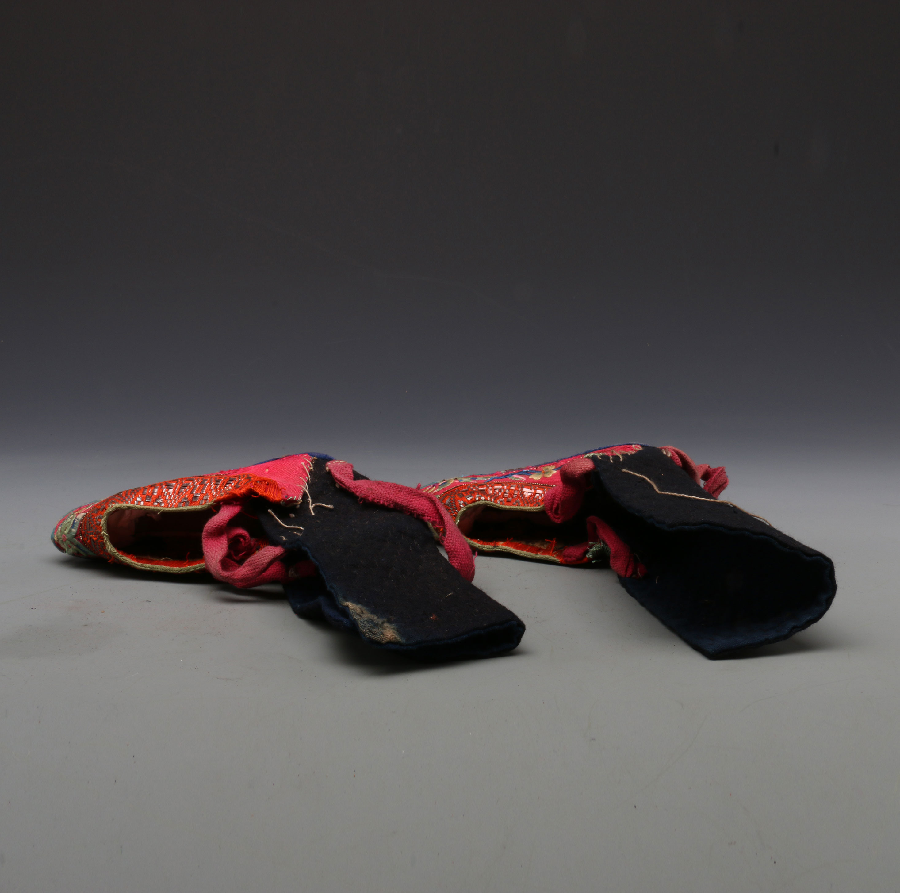 年代:1886年;尺寸:长13cm,宽4.8cm,高22cm。鞋木底,鞋面红布绣花,裹脚蓝布较厚,但裹脚较高。古代女孩一般在五六岁时开始缠足,其方法是用长布条将拇趾以外的四个脚趾连同脚掌折断弯向脚心,形成“笋”形的“三寸金莲”,而这块蓝色裹脚布厚且短,但较高。