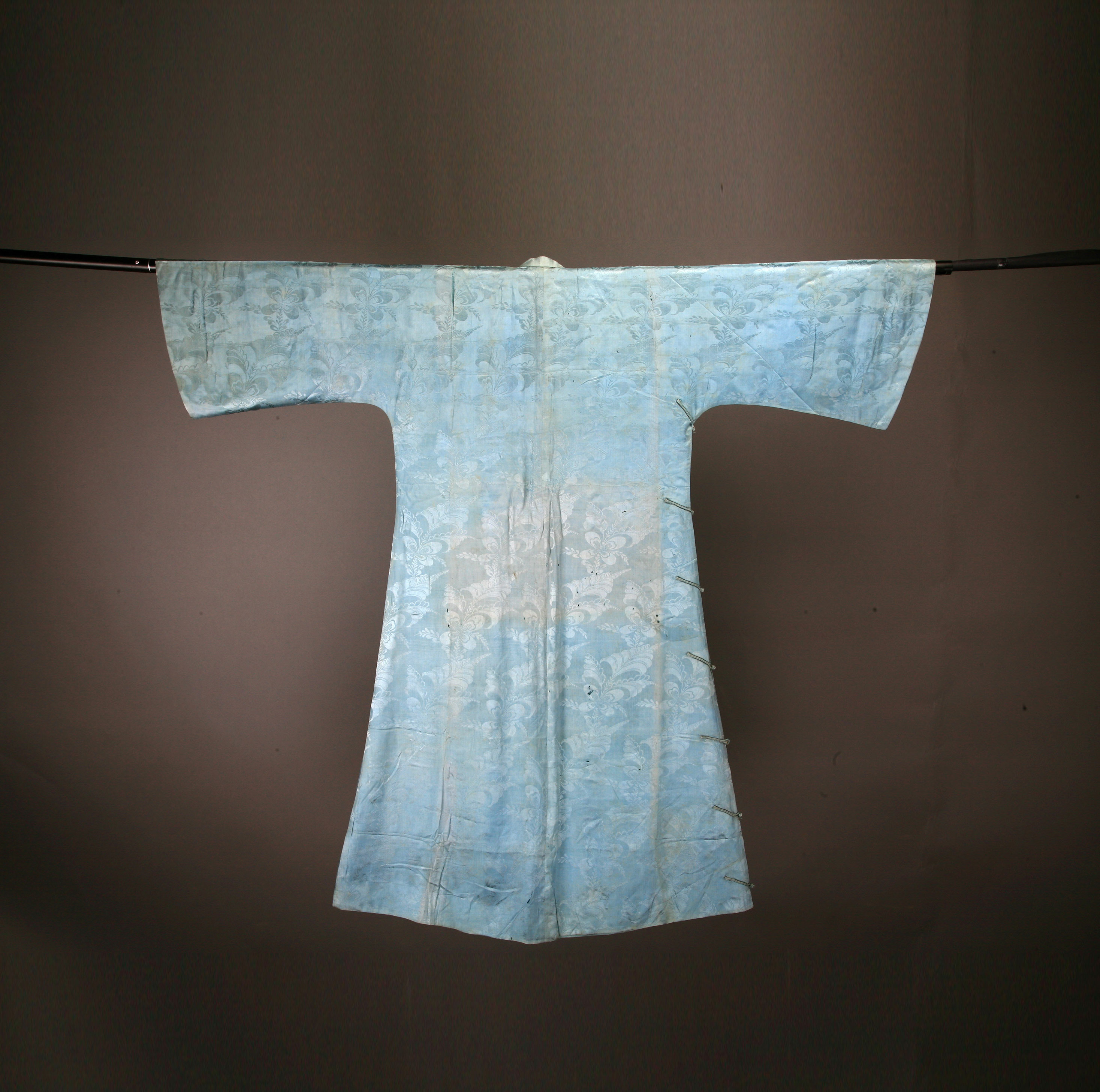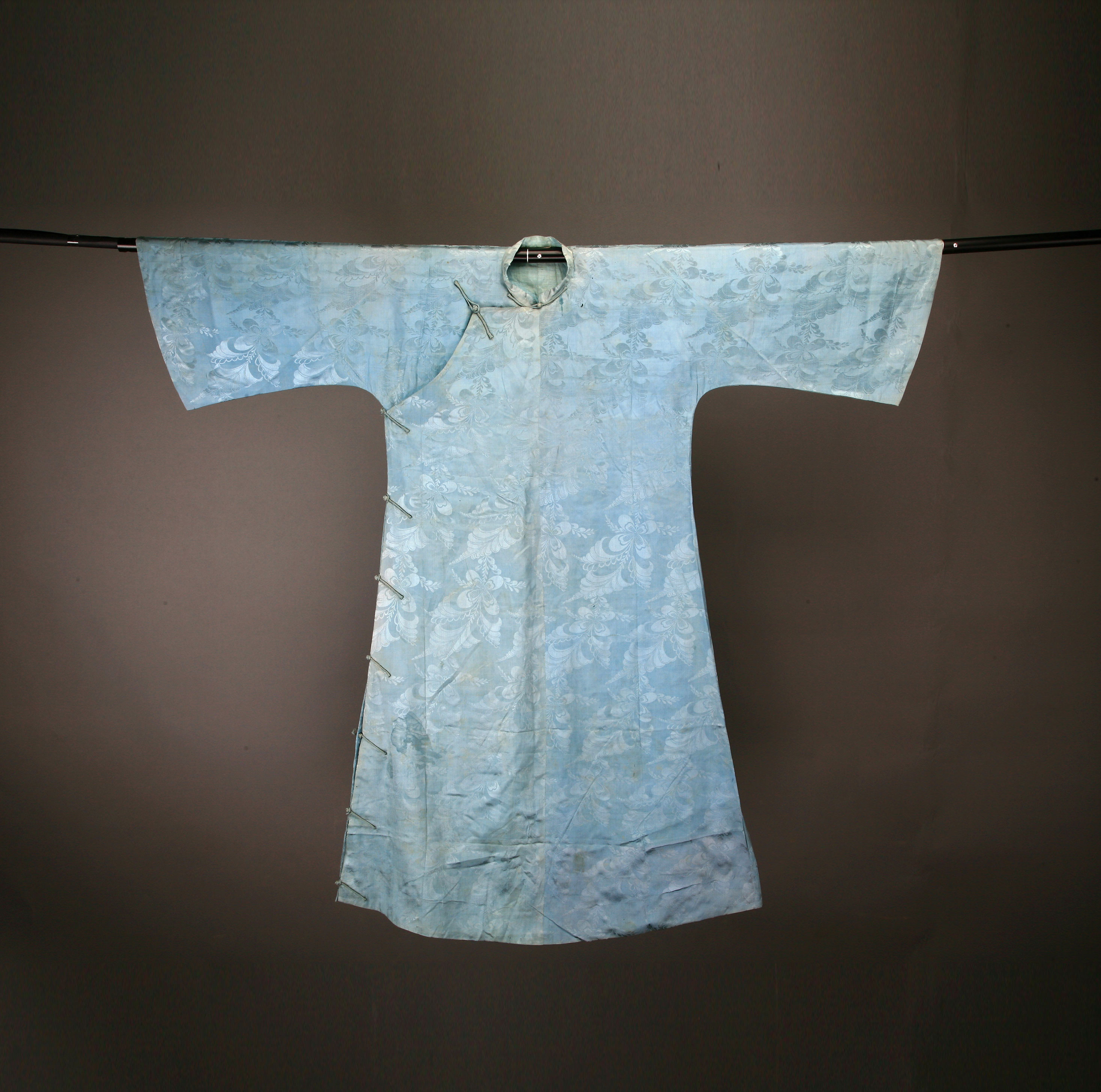 年代:中华民国;尺寸:连袖长121cm,宽72cm,高108cm。有领,宽袖。宽体,斜襟。饰浅蓝色暗花。是中华民国时期开平男人所穿长袍。