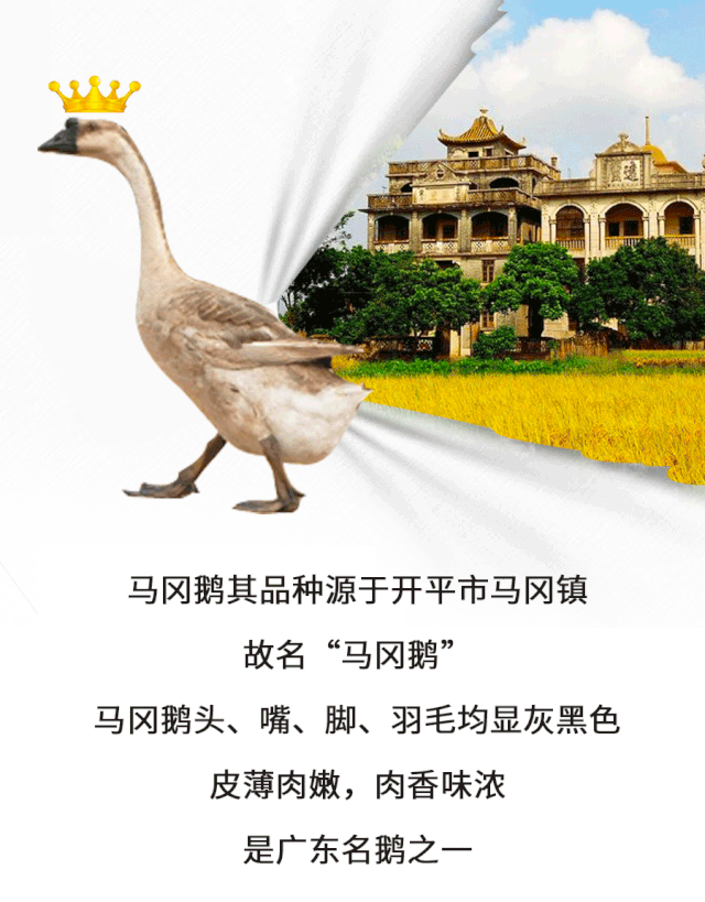 一百多年前的1825年,开平马冈镇翠山村村民梁奕德,从高明县三洲引入公鹅,与取自阳江县的母鹅配种,育出了优良的新品种,后来再将新品种鹅与来自潮州的潮州鹅配种,经过长期的系统选育,终于培育出了一个全新的优良品种——马冈鹅。