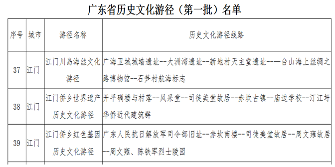 近日 广东省文化和旅游厅公布了 第一批广东省历史文化游径名单 江门有3条历史文化游径上榜! 开平不少景点入选其中两条线路! 来看看分别是哪几条路线吧~ 什么是“历史文化游径”呀 这些游径又有怎样的魅力呢? 历史文化游径 文化游径的标识系统等基础设施建设,完善旅客服务和提升游径的可游可读性,为广大市民及游客群众打造“低价高质”的文化游憩空间。 下面 为大家介绍一下这些线路 ↓↓↓ 江门侨乡世界遗产历史文化游径 游径主题:以侨乡文化为主题,线路串联了碉楼、传统民居、乡镇村落景观和田野乡村风光,展现江门侨乡特色的人文文化。 游径资源选点:开平碉楼与村落——风采堂——司徒美堂故居——赤坎古镇——庙边学校——汀江圩华侨近代建筑群 游径导览图: 1 开平碉楼与村落 自力村 彭伟宗摄 立园 彭伟宗摄 被称为世界上规模最大的“碉楼博物馆”。这里古老的建筑和氛围都保存得非常完好,身处其中仿佛穿越回去那个年代。这里的每一栋碉楼,一砖一瓦,都记录着开平这个地方的老故事,等着你来细细品味。 2 风采堂 景区供图 风采堂是余氏族人为纪念北宋名臣余靖(1000—1064年)集资而建,始建于1906年(清光绪三十二年),1915年建成,由名贤余忠襄公祠、风采楼、门楼、环形祠墙和长堤组成,总占地面积10007平方米,在中国及世界余氏华人中具有重要影响。 景区供图 名贤余忠襄公祠始建于1906年,1914建成,总面宽54.80米,总进深50.8米,总建筑面积3765平方米,规模宏大,采用砖、石、钢、木和钢筋混凝土组合结构,建筑形制和装饰以岭南宗祠特色为主,巧妙地揉进了西洋建筑元素,将中国、希腊、罗马和伊斯兰的建筑艺术以及西方的工业技术溶于一体,为多元文化融合的典范。从整体造型艺术到细部装饰艺术都经过精心的筛选,达到很高的造诣。 景区供图 风采堂是国内祠堂建筑中西合璧的典范之作,又是祠校合一的杰出代表,是广东侨乡中西文化交融的杰作,是岭南地区祠堂的杰出代表,具有独特性及重要历史、科学、社会、人文价值。 3 司徒美堂故居 司徒美堂故居位于广东省江门市开平市赤坎镇中股村委会牛路里第四巷6号对面。司徒美堂(1968~1955年),原名羡意,字基赞,赤坎中股牛路里人,著名旅美侨领,中国致公党创始人之一。清光绪六年(1880)到美国谋生,光绪十一年(1885)加入洪门致公堂,曾对辛亥革命、抗日战争和解放战争做出重要贡献。1949年回国,历任中央人民政府委员会、全国人大常务委员会委员、全国政协委员、中央华侨事务委员会委员等职,并参加了中华人民共和国开国大典。司徒美堂故居坐东北向西南,是一座 历史文化游径是能够有效串联一定区域内价值突出、保存较好的历史文化遗产的游憩通道,包括沿袭历史线路的陆路和水路,以及沿线重要的文物遗产和自然资源景观。此次省文旅厅公布的第一批广东省历史文化游径共有64条,江门市推荐的“江门川岛海丝文化游径”、“江门侨乡世界遗产历史文化游径”、“江门侨乡红色基因历史文化游径”三条游径全部入选。 2019年,广东省文化和旅游厅下发《广东省文化和旅游厅关于做好2019年广东省历史文化游径建设工作的通知》(粤文旅文保〔2019〕83号),制定了《广东省历史文化游径创建工作指引》,积极部署历史文化游径建设工作。 因此,江门市文化广电旅游体育局积极响应,按照省文旅厅有关工作指引,依托市内丰富的海丝文化资源、世界文化遗产资源和红色历史文化资源,选取富有特色的文物资源点,融合我市侨乡历史文化游径建设工作,分别挑选海丝文化体验之旅、世遗侨乡文化导览休闲路线、爱国爱乡红色革命文化旅游线路等能鲜明突出我市文化特色、有效整合串联沿线的三条历史文化旅游线路进行打造,以达到促进文化遗产的保护与传承,推动文化和旅游融合发展,加快文化和旅游强市建设的目的。 下一步,江门市文化广电旅游体育局将结合我市侨乡历史文化游径精华十二段的打造工作,继续做好历史三廊二房一厅的瓦顶、砖木结构的典型南方民居,右侧前面附有下廊,总占地面积为111.49平方米。司徒美堂故居是新时代重要的爱国主义教育基地和统一战线工作教育基地。2019年10月7日被列为第八批全国重点文物保护单位。 4 赤坎古镇 赤坎古镇 李贤杰摄 赤坎古镇距今已有350年的历史,曾是粤西地区最繁华的中心集镇之一,有岭南名镇、百年商埠和侨乡的美誉。古镇中的潭江穿镇而过,大量建于20世纪的商业骑楼绵延数里,沧桑厚重的鹅卵石街、班驳缕空的窗花、精雕雅致的灰塑,形成了古镇独有的风貌。 5 庙边学校 彭伟宗摄 庙边学校位于台山市端芬镇庙边村委会蓝田村,中华民国十七年(1928)由当地旅美华侨捐资兴建。 彭伟宗摄 建筑坐北向南,钢筋混凝土构架结构,主楼高五层23.5米,宽45.38米,深23.06米,占地面积1046.46平方米。平面呈十字形。主楼高三层,穹顶瞭望亭设在梯间上,两翼二层,平屋顶。室内设置教室8间和办公室、纪念堂、阅览室、储物室(半地下室)各1间。正面11级台阶突出中心入口位置。青砖墙体并衬托白色的饰图。门额牌匾刻“庙边学校”四字,上款“翁松安书”。建筑正前方为操场,约60米处有建于同一时期的牌楼。庙边学校是台山近代典型中西合璧建筑,是华侨实现“教育救国”的重要实物资料,对华侨历史、华侨文化和近现代建筑艺术具
