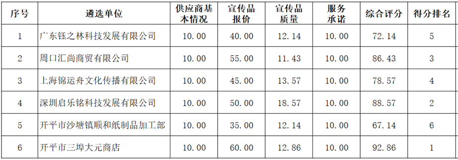 开平市三埠街道办事处社区卫生服务中心于2024年6月24日就三埠街道办事处社区卫生服务中心公开征集遴选2024-2025年度国家基本公共卫生服务项目宣传品采购供应商进行了遴选,现就本次遴选的中选结果公告如下: 一、项目名称:三埠街道办事处社区卫生服务中心2024-2025年度国家基本公共卫生服务项目宣传品采购项目 二、项目标的信息: 三、遴选时间:2024年6月24日上午10:00 四、遴选地点:三埠街道办事处社区卫生服务中心综合大楼五楼会议室 五、参与遴选单位: 1.广东钰之林科技发展有限公司 2.周口汇尚商贸有限公司 3.上海锦运舟文化传播有限公司 4.深圳启乐铭科技发展有限公司 5.开平市沙塘镇顺和纸制品加工部 6.开平市三埠大元商店 六、遴选结果:经遴选,拟选取综合评分排名第一的“开平市三埠大元商店”为三埠街道办事处社区卫生服务中心2024-2025年度国家基本公共卫生服务项目宣传品采购供应商,中标总价597850元。 七、公示期限:自发布之日起至6月28日。 八、其他补充事宜 各有关当事人如对遴选结果有异议的,请于公示期内以书面方式向开平市三埠街道办事处社区卫生服务中心或开平市卫生健康局反映。 联系人:甄小姐,电话:0750-2338780 地址:开平市三埠荻海中和路272号 监督电话:开平市卫生健康局 0750-2252003 开平市三埠街道办事处社区卫生服务中心 2024年6月27日