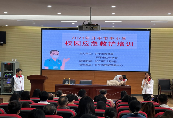 “薪火聚温暖,急救在身边”。为提高我市中小学教职工校园安全意识以及提升校园突发事件时的应急处置能力,保障我市中小学师生生命健康安全。12月6日,开平市红十字会联合市教育局,在市教师发展中心开展了中小学校园应急救护培训,市教育局、市红十字会相关领导及我市中小学校政教主任、团队干部等90余人参加了此次培训。