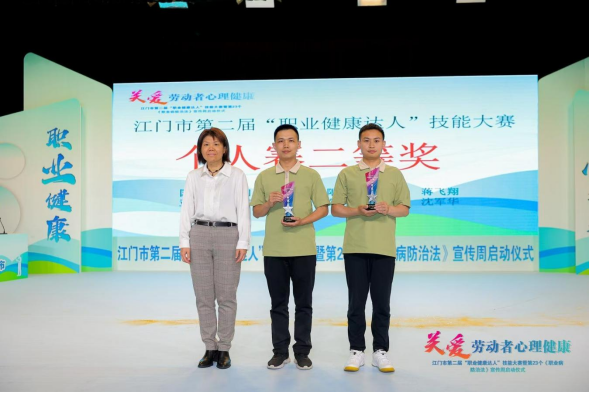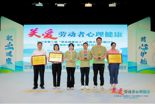 开平市卫生健康局高度重视此次比赛,赛前精心组织选拔参赛人员,积极开展针对性培训和排练。比赛现场,我市参赛队伍3名参赛队员精神饱满、沉着冷静,在各个环节中各展所能。理论知识测试环节,认真思考、精准作答;操作技能比拼中,规范熟练完成各项操作;健康影响力能力展示环节,创意十足,通过小品、模拟演练等生动方式科普职业健康知识。