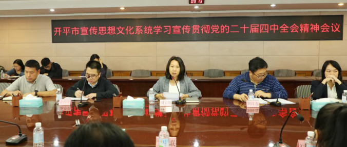 10月29日上午,开平市委宣传部组织召开全市宣传文化系统学习宣传贯彻党的二十届四中全会精神专题会议,传达学习习近平总书记在党的二十届四中全会上的重要讲话和全会精神,贯彻落实省委、江门市委、开平市委有关会议精神,研究全市宣传文化系统贯彻落实措施。市委常委、宣传部部长周宝珠出席并讲话。