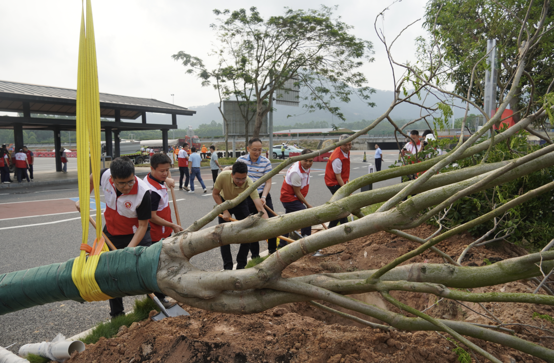 活动现场,来自江门市交通运输局、开平市交通运输局、广东开阳高速公路有限公司等部门单位及志愿者热情高涨、干劲十足。大家挥锹铲土、扶苗填坑、踩实浇水,每一道工序都有条不紊、细致入微。经过辛勤劳作,23株凤凰木、宫粉紫荆、蒲葵等树苗整齐挺立,枝叶舒展,为交通窗口披上清新“绿装”,让过往司乘在旅途中感受绿色暖意。