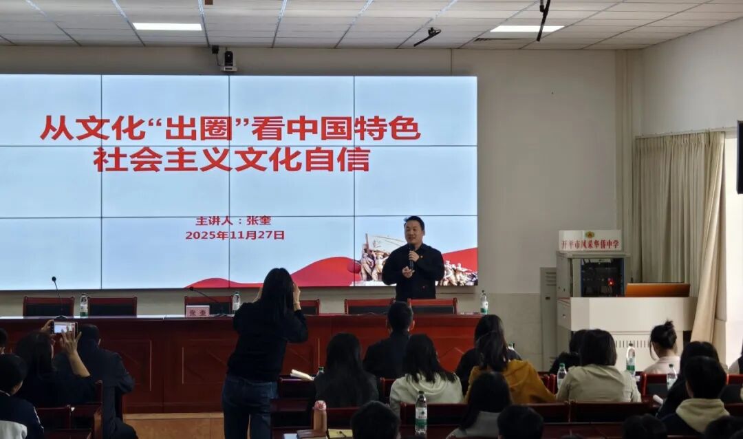 华南理工大学马克思主义学院团委书记张奎为师生作主题宣讲,紧扣文化“出圈”这一时代热点,深入解读了其中蕴含的文化自信密码。以鲜活例证和深刻分析,引导师生深刻感悟中国特色社会主义文化的强大生命力,进一步坚定了大家的文化信念。
