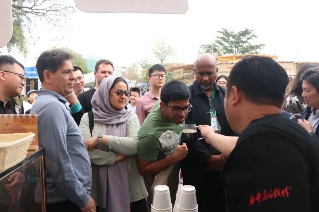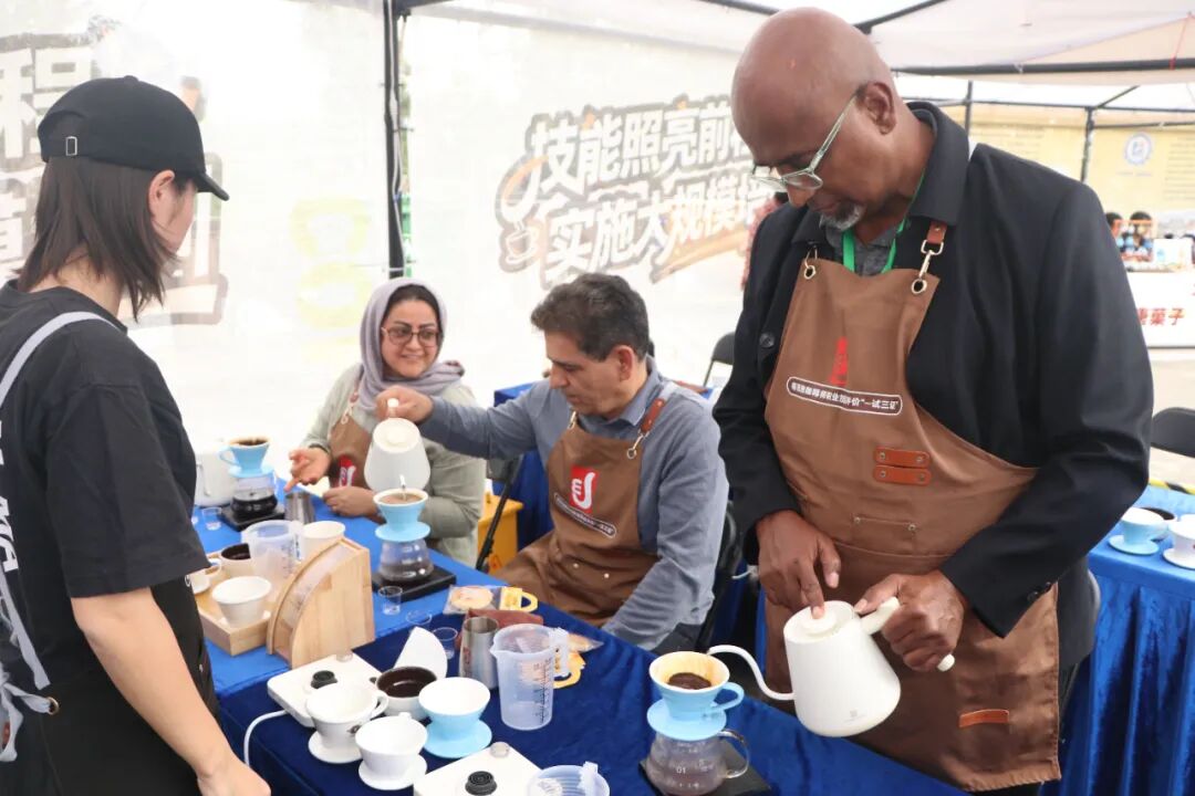 在大赛配套活动中,外国友人现场品咖啡、逛市集,了解先进咖啡设备,并在“即学即会”手冲咖啡公益课上体验咖啡冲煮。