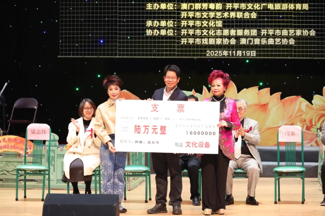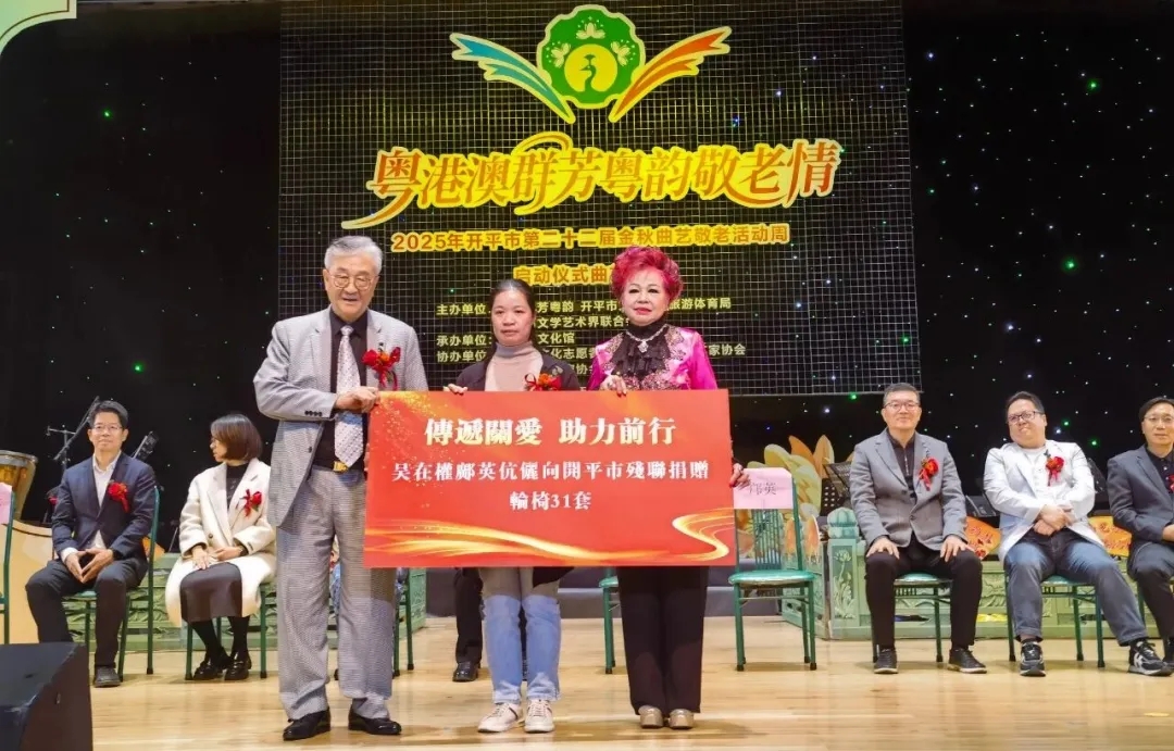 本次曲艺晚会由澳门群芳粤韵、开平市文广旅体局、开平市文联联合主办。仪式上,澳门乡亲邝英、澳门同胞卢丽仪向开平捐赠6万元,用于购买文化设备。同时,活动现场还举行了“传递关爱 助力前行”轮椅捐赠仪式,澳门原第三第四届立法会议员,澳门房地产联合商会会长吴在权、邝英伉俪向开平捐赠31套爱心轮椅。活动最后,澳门乡亲邝英和卢丽仪女士还为在场观众送上澳门特色礼品与红包,传递敬老温情。