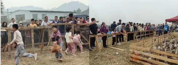 优品展销会汇聚了全市蛋制品、手工腊味、茶叶等各类优质农产品。美食摊位前人头攒动,游客们穿梭在各个摊位之间,品尝着地道的美食,挑选着心仪的农产品,现场气氛热烈。徒手捉鸡、圈圈套鹅等互动游戏让城乡游客在欢声笑语中拉近距离。