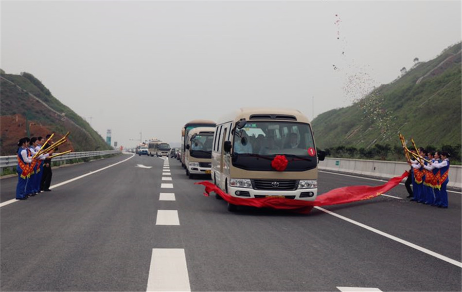 随着现场宣布高恩高速通车,一排车队撞线驶上高恩高速。
