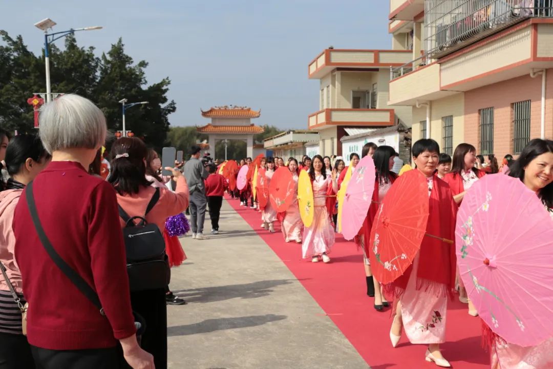 当日上午,东明村锣鼓喧天,鞭炮齐鸣,举行了出嫁女回娘家仪式。在醒狮的引领下,该村300多名出嫁女身着鲜艳旗袍,或手撑油纸伞、高举标语,或肩挑礼担,带着幸福的笑容,一起踏上充满儿时回忆的道路,共同感受东明村乡村振兴的建设成果。一路上,乡亲们夹道欢迎,喜庆的队伍从村口一直延伸到村内,形成一道靓丽的风景线。