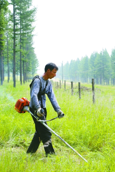 长腿泡子营林区职工进行割灌作业,让林间幼苗获得充足的阳光与养分。记者 马列摄/光明图片