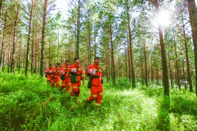森林防火站的消防员在林地巡查。记者 周梦爽摄/光明图片