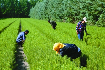职工为千层板林场苗圃的树木幼苗除草。记者 马列摄/光明图片