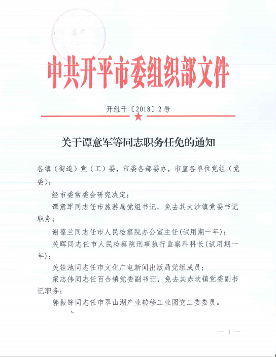 (开组干[2018]2号)关于谭意军等同志职务任免的通知