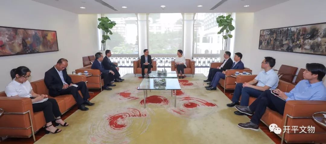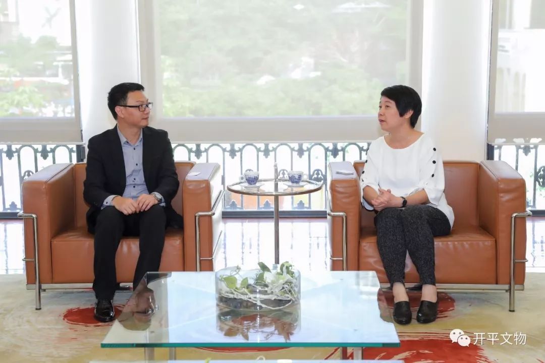 6月15日,陈顺文一行拜会了澳门特别行政区政府文化局副局长梁惠敏,文化遗产厅厅长黄一翔,文化遗产厅文化遗产保护处处长蔡健龙等官员,并进行了会谈。参与会谈的还有立法会麦瑞权议员,开平籍乡贤余焯源先生、方焕兴先生。陈顺文向梁惠敏等人介绍了开平碉楼与村落世界文化遗产的保护与活化利用情况,认为澳门历史城区、开平碉楼与村落是粤港澳大湾区目前仅有的两处世界文化遗产,距离最近,在地理位置、建筑工艺、建筑特色等方面都有很多相同或相近之处,澳门方面在世界文化遗产的保护与文化创意等方面取得很多成功经验,希望双方在文化遗产的保护与文化创意、展览交流、人才培训、文化遗产传播等方面能加强合作,共同为打造粤港澳大湾区文化高地作出努力。