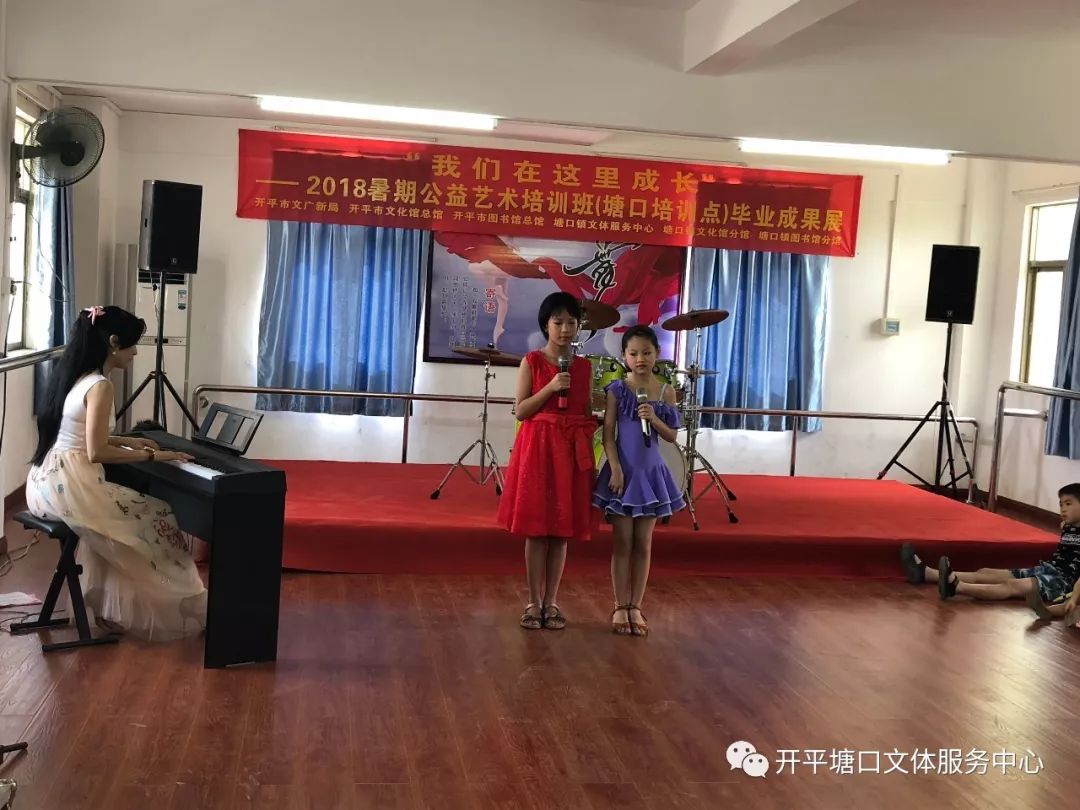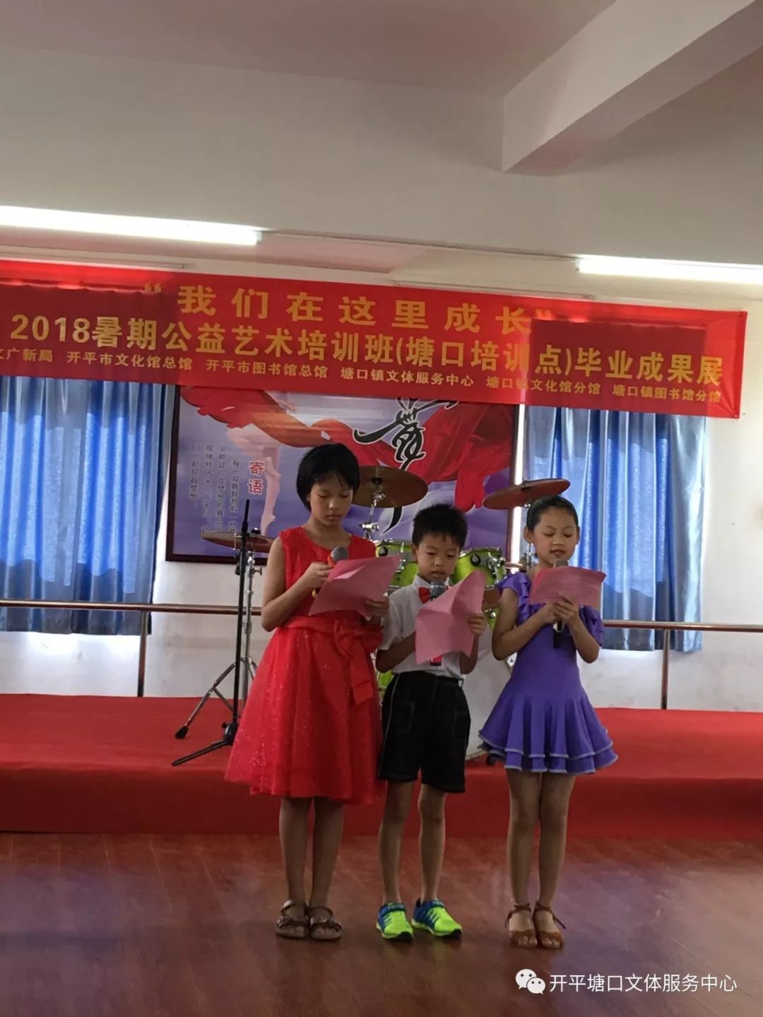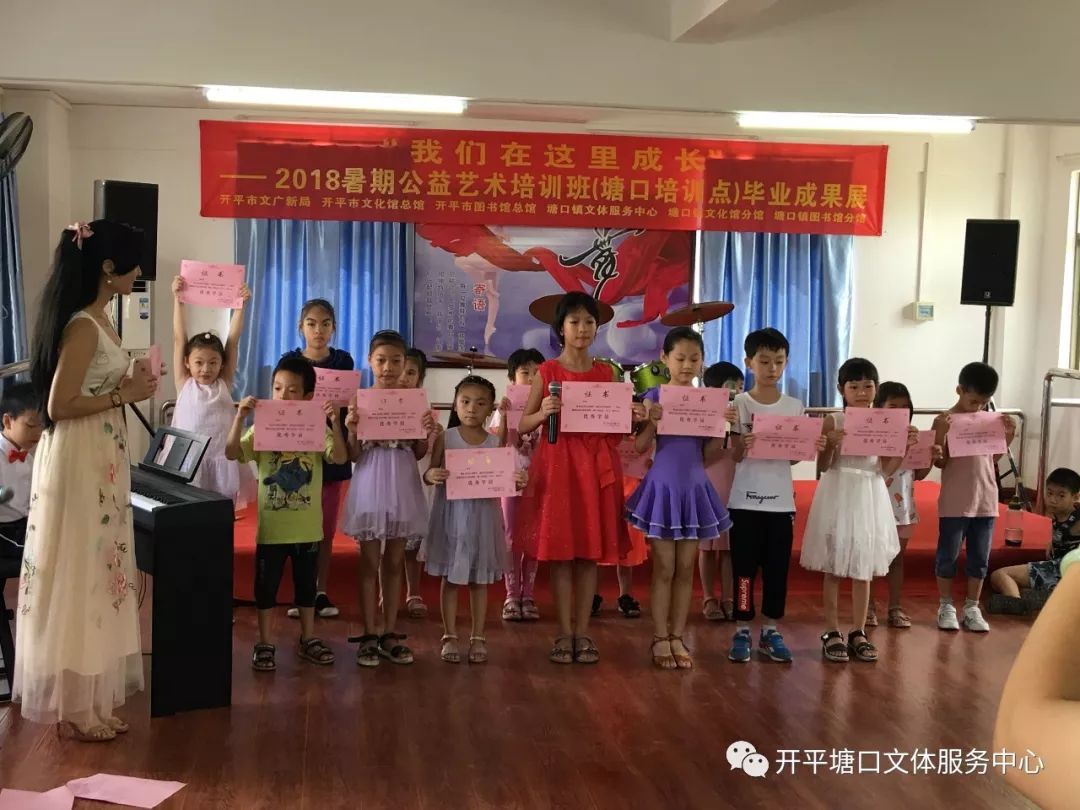 为了积极响应我市创建全国文明城市的号召,以实际行动汇聚起创建全国文明城市的强大正能量,为建设和谐幸福开平作出应有的贡献,并积极推进广东省文化馆总分馆服务体系建设,实现活动联办,让文化资源更好地流动起来,并进一步让公共文化服务设施向社会免费开放,为广大艺术爱好者提供一个免费提升艺术技艺的学习机会,丰富我镇青少年暑期生活,我镇于7月16日开展了“我们在这里成长”—2018开平市暑期公益艺术培训班(塘口分馆),历时两周,终于在7月27日早上完美收官并举行毕业成果展。