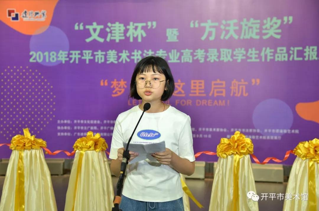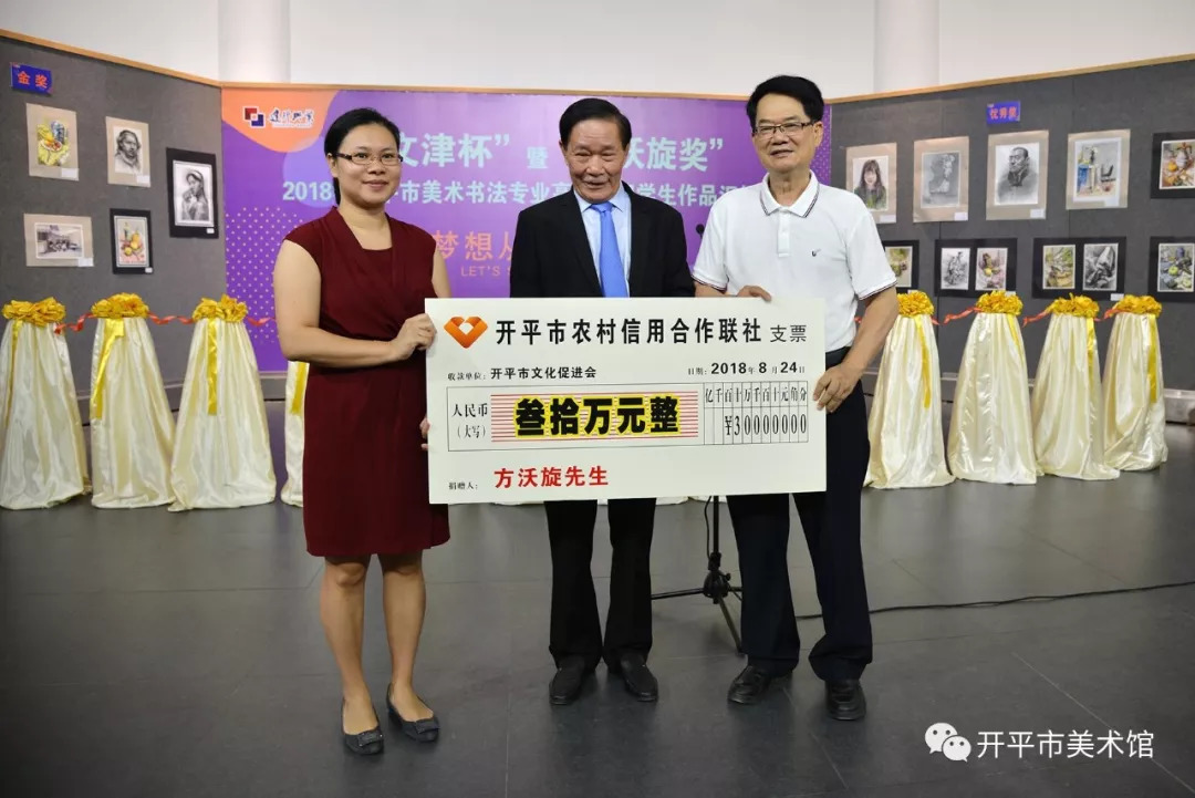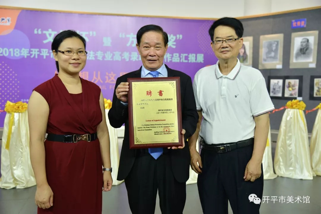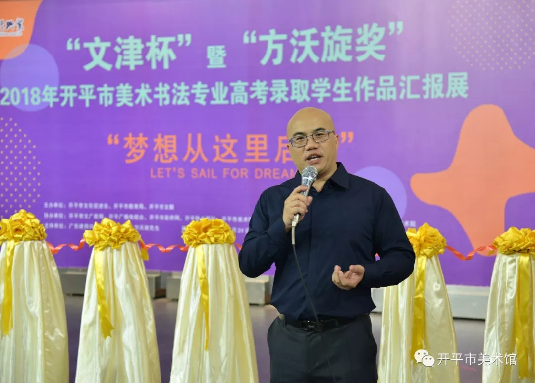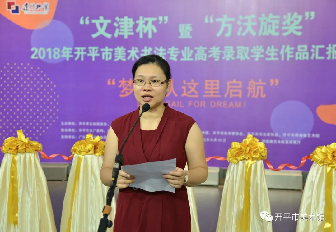 2018年8月24日下午,由开平市文化促进会、开平市教育局、开平市文联主办的“文津杯”暨“方沃旋奖”2018年开平市美术书法专业高考录取学生作品汇报展开幕典礼在开平市美术馆隆重举行。开平市领导黄力奔、市文化促进会创会会长谭思哲以及有关部门领导、支持单位、有关学校老师、获奖学生等300多人出席了大会。