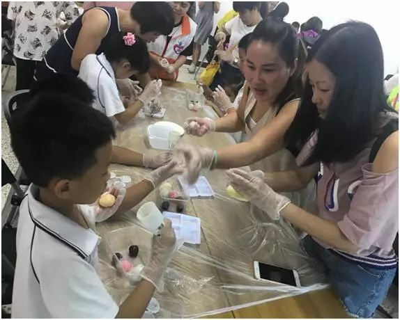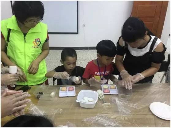 活动现场,巾帼志愿者们提前准备了纯手工制作的红豆馅料和冰皮粉, 孩子和家长们围坐在一桌,一起和面、擀面皮、包馅料,在模具里把月饼压扁,忙得不亦乐乎,一个个漂亮的冰皮月饼不断出现在眼前,孩子们看着自己的劳动成果都兴奋不已。