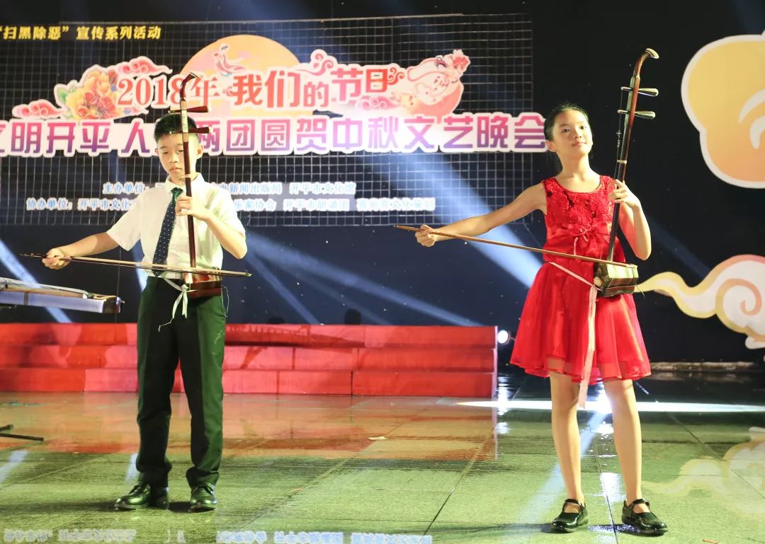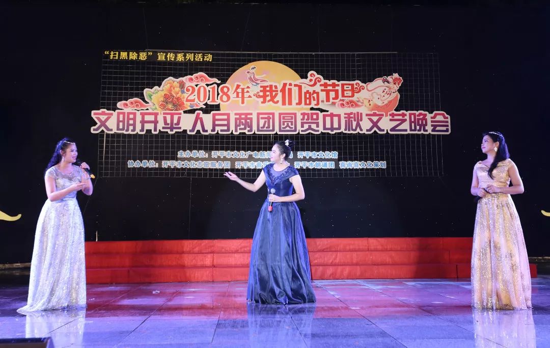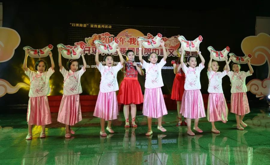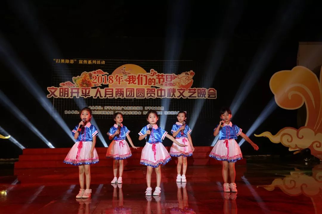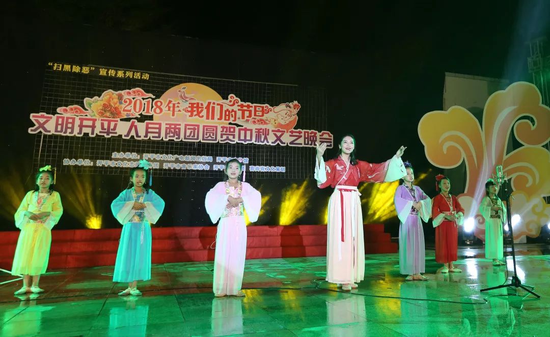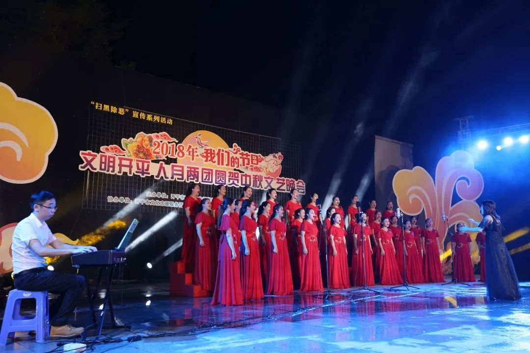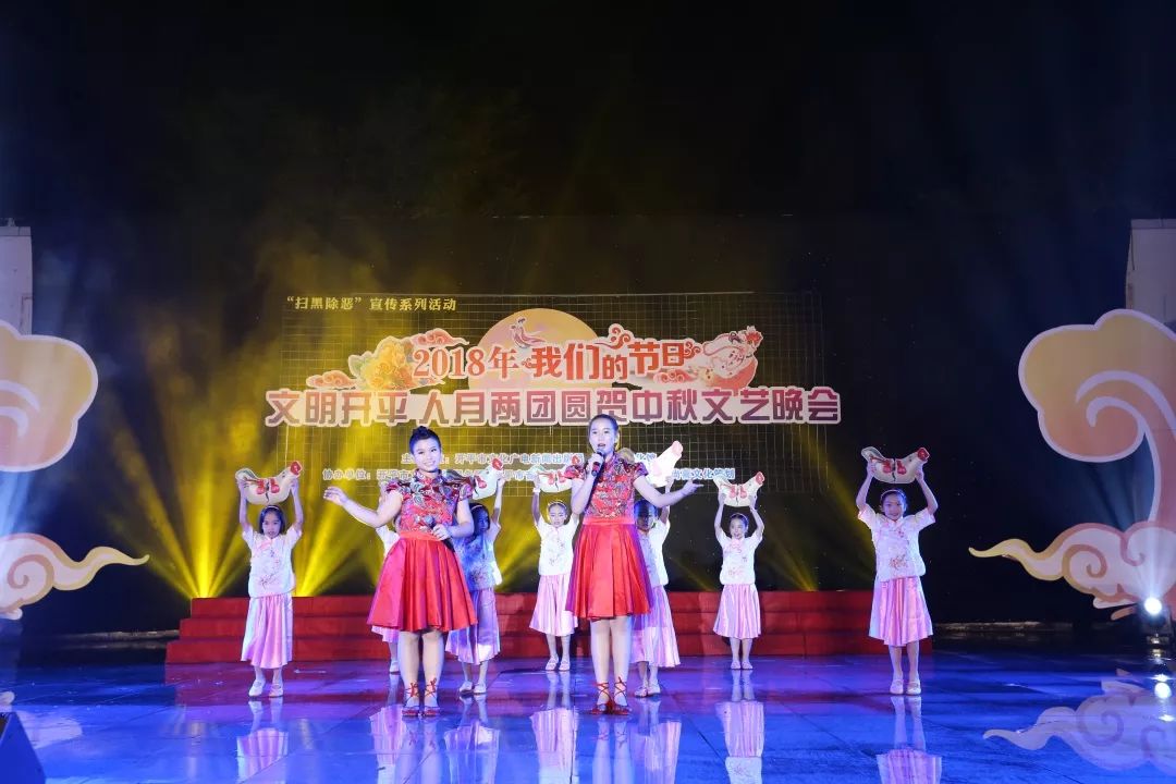 晚会在激情澎湃的电声乐队《让我留在你身边》中拉开帷幕,虽然下着微雨 ,但是丝毫没有影响观众的热情。最后,天公作美,雨渐渐停了,市民朋友们共聚,一起欣赏器乐联奏《我的祖国》、女声独唱《美丽的日子》、朗诵《中秋》《中秋之夜》《水调歌头•明月几时有》、女声组合表演唱《欢天喜地》、大合唱《灯碗碗开花在窗台》《家在开平》等精彩节目,一起汇聚四面八方的欢歌笑语,共同吟唱秋之收获,秋之风情。其中,童声对唱《吹泥鸡》是专门为了江门市级“非遗”项目镇濠泥鸡制作技艺而创作的;而合唱《家在开平》是开平原创歌曲,为宣传开平市创建全国文明城市而作,通过歌曲的宣传,让广大市民了解创文,并积极参与到创文行动中来。