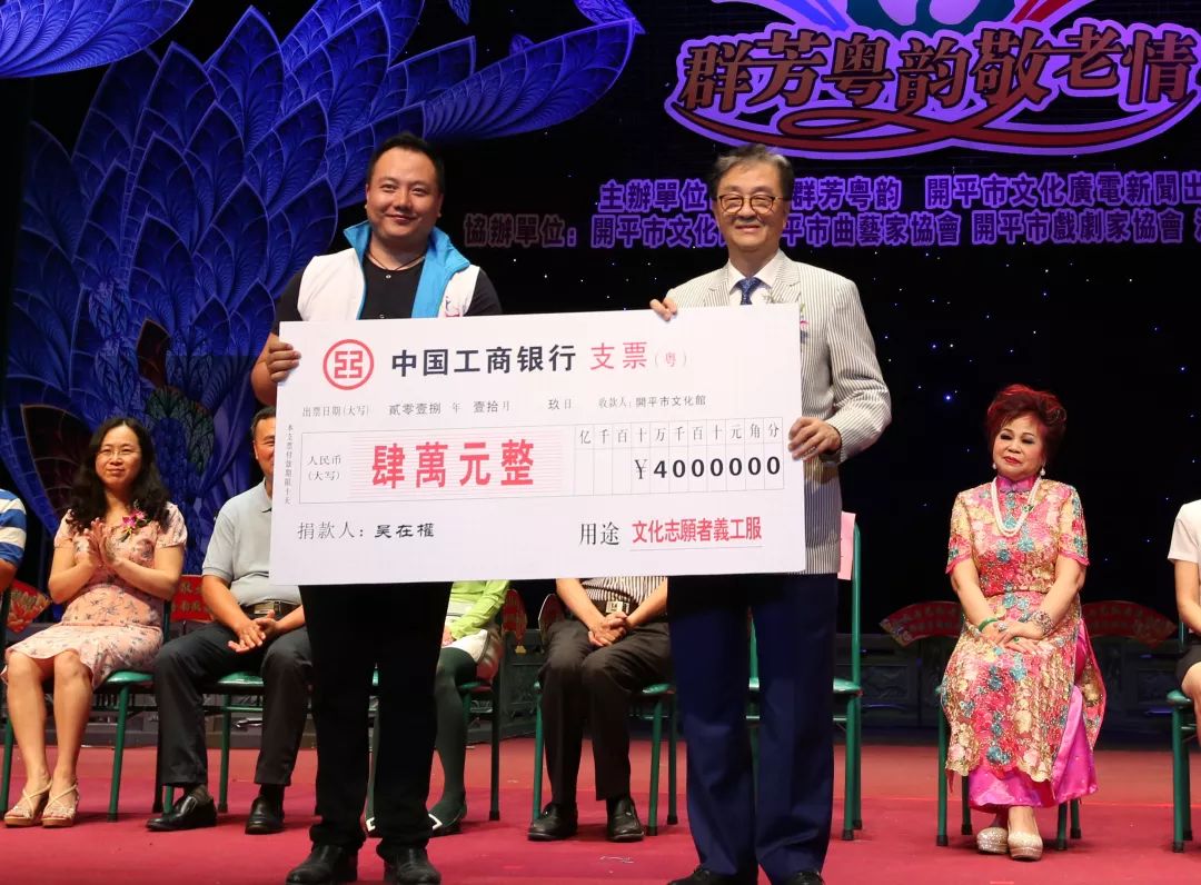 当晚,吴在权、邝英伉俪及卢丽仪女士还再次捐赠价值4万元的文化设备和4万元的志愿者服装供市文化部门使用。架起澳门与开平交流互动的桥梁与平台,获得了社会各界的广泛赞扬。