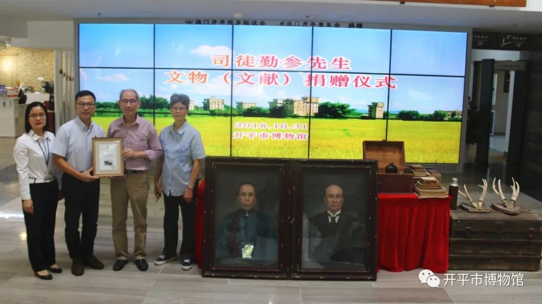 开平市文广新局局长谭伟强、市文物局副主任科员吴就良、市博物馆馆长李少珍等领导出席捐赠仪式。仪式上,司徒勤参先生向开平市博物馆捐赠其祖先人像油画2幅、鹿角挂饰1对、鸦片枪木盒1个、杉木箱1个、20世纪上半叶金山箱1个、外国玻璃瓶5个、保温瓶1个,1950—1960年代科普、文学、水利、教科书、土木工程学读书笔记等文献资料88本,对研究开平历史文化有着重要意义。