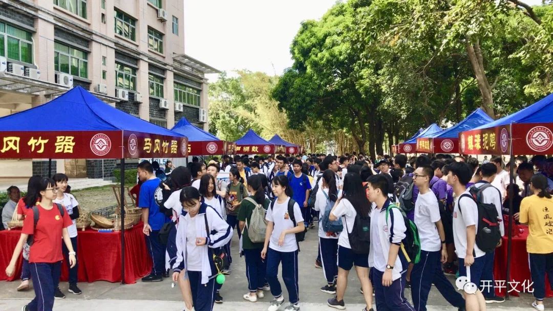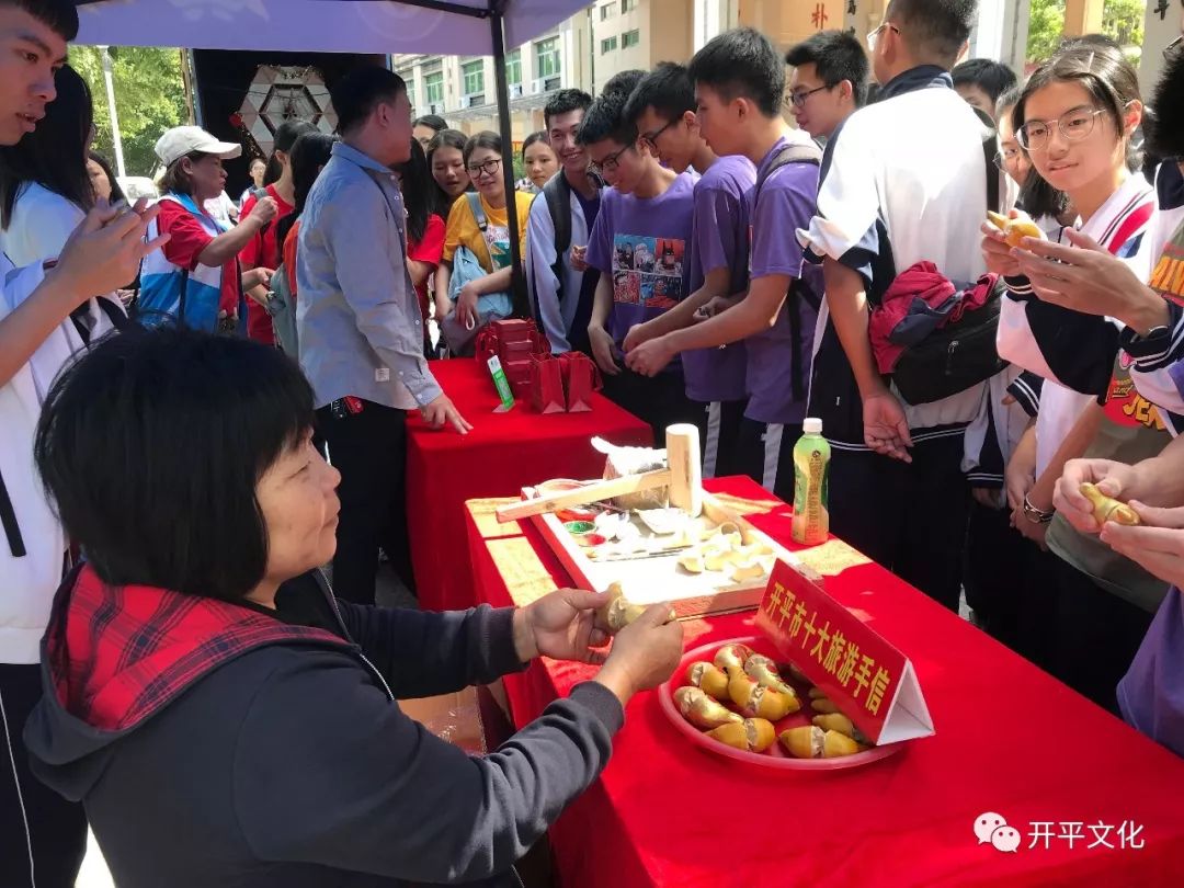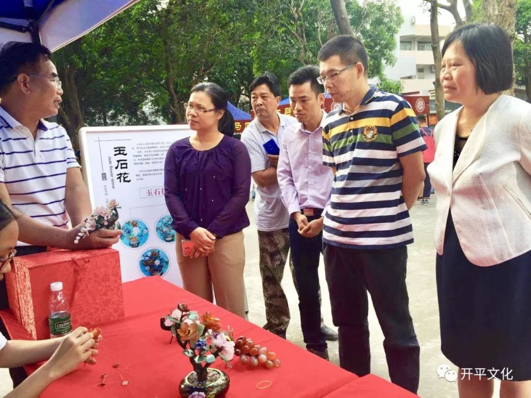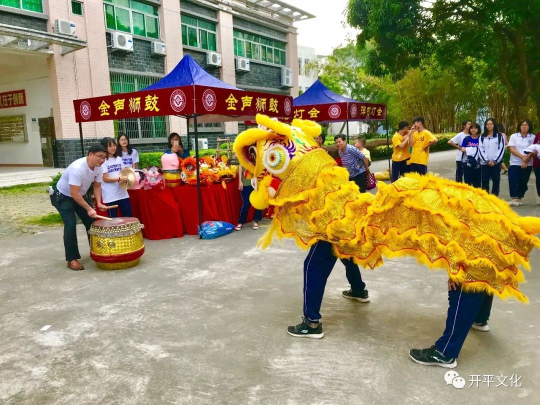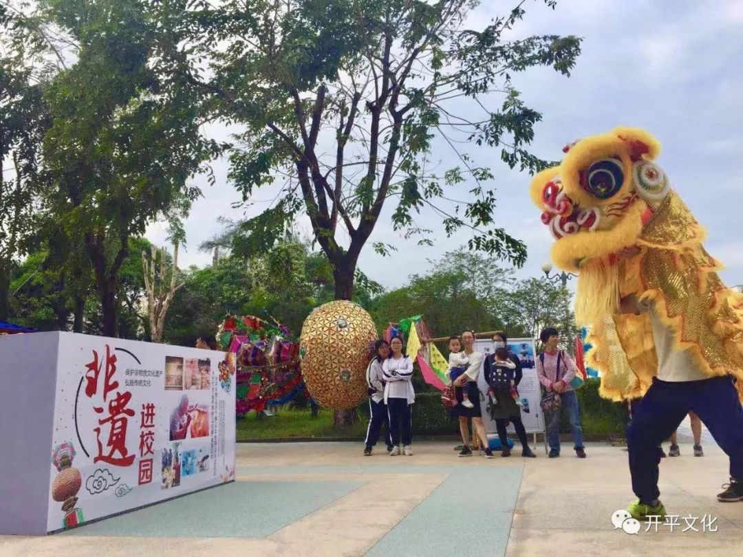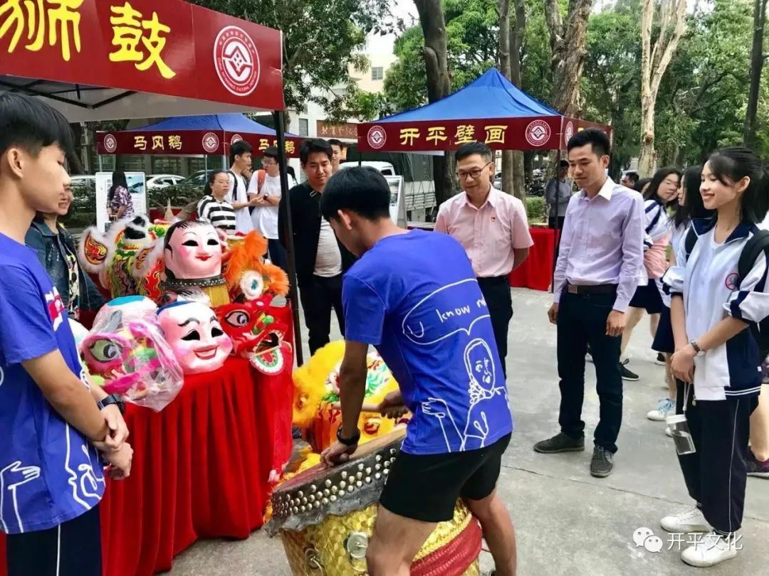 11月1日,在开侨中学举行的非遗展上,泮村灯会、金声狮鼓制作技艺、开平灰塑、镇濠泥鸡制作技艺、马冈竹器制作技艺、马冈鹅、开平壁画、水口玉石花(意向非遗项目)等项目的传承人通过解说、现场示范、与学生互动等方式,向学生展示、传承,不少学生表现出强烈的兴趣,亲身体验舞狮、打鼓、扎玉石花、吹泥鸡、画壁画、批修灰塑等等,近距离接触非遗技艺,更好地感受传统文化的魅力。三埠金声狮鼓店还向开侨中学赠送狮鼓一套,鼓励学生武术社团学习传统技艺,弘扬传统文化。