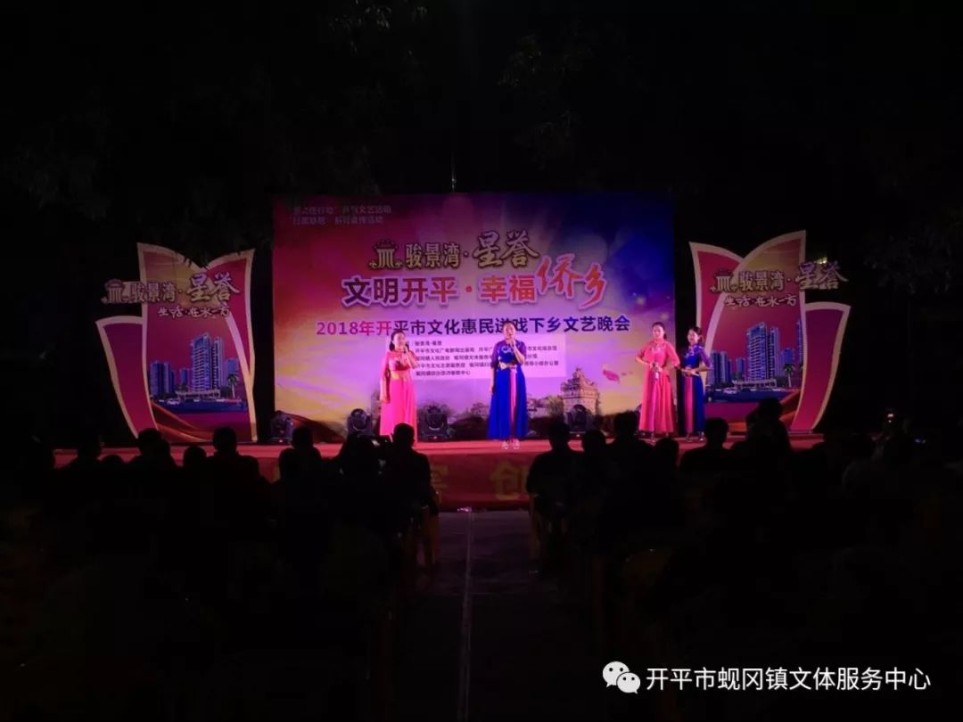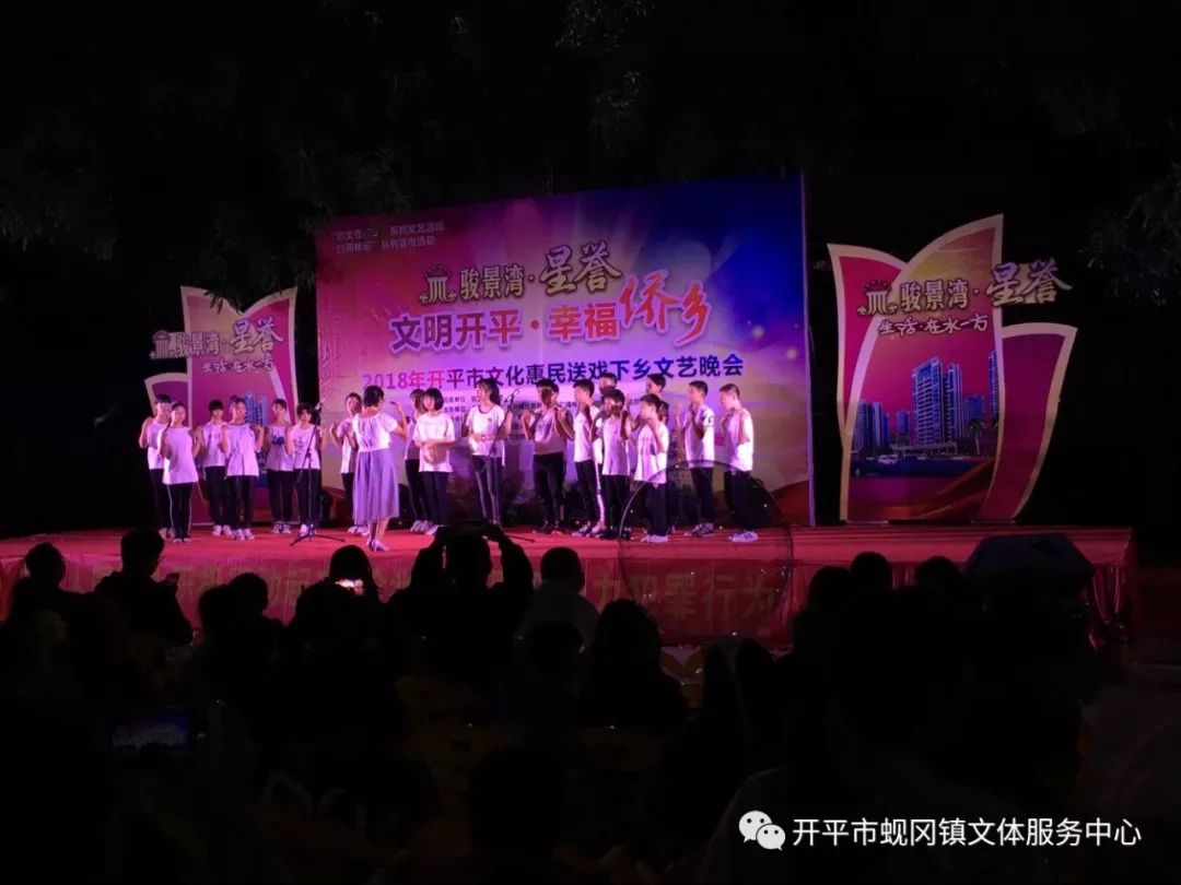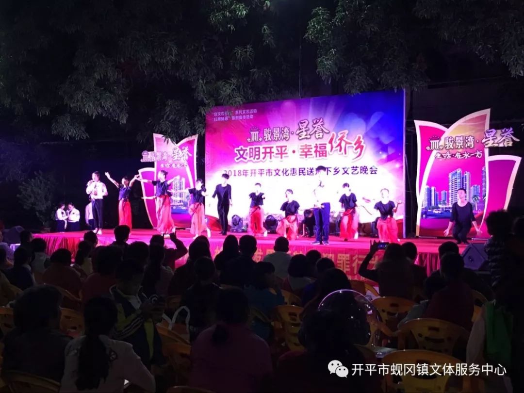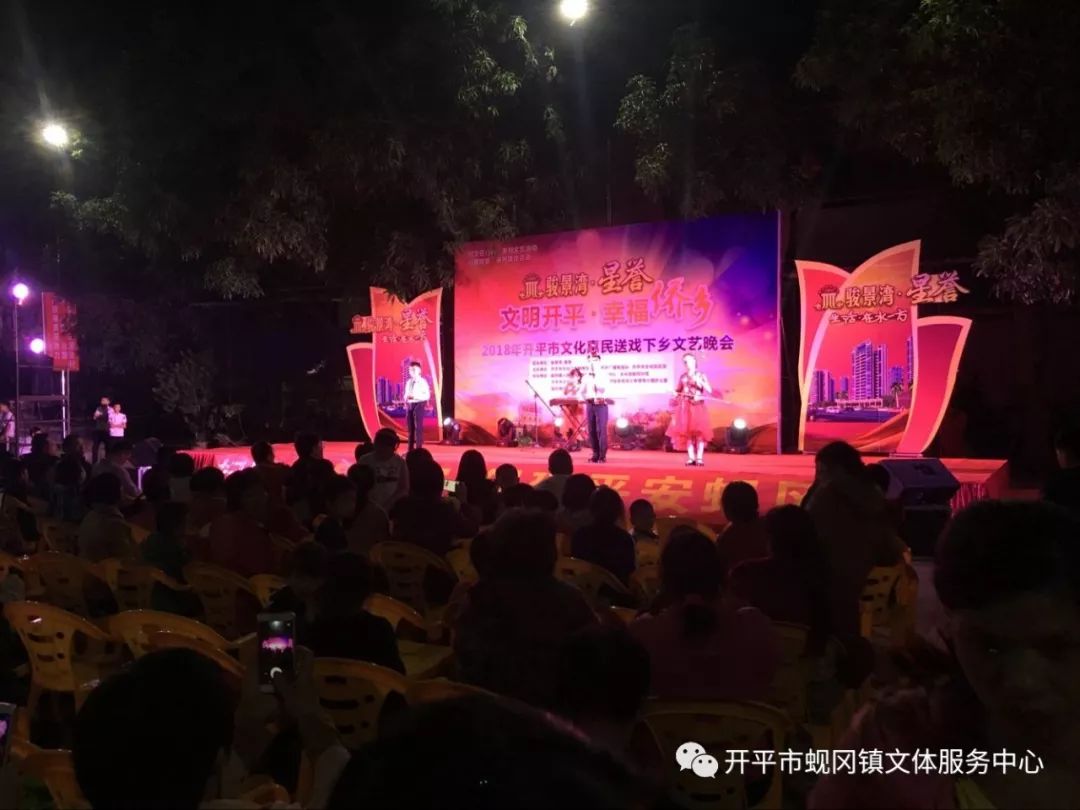 2018年11月22日晚上,由开平市文广新局、开平广播电视台、市文化馆主办的骏景湾•星誉“文明开平•幸福侨乡”文化惠民送戏下乡巡演来到蚬冈镇文化广场,给当地村民带来了一场歌舞盛宴。蚬冈镇全体领导班子出席了本次晚会,各部门干部、蚬冈派出所、辖区群众、学生等500多人共同参与。