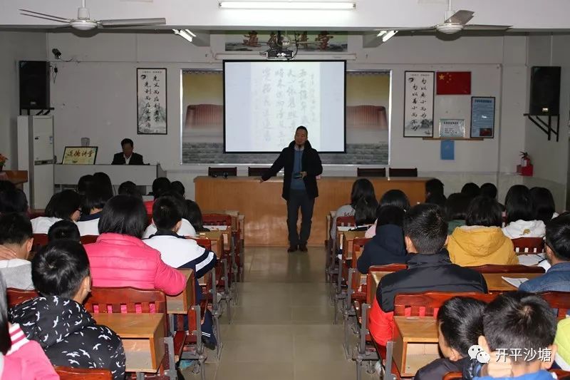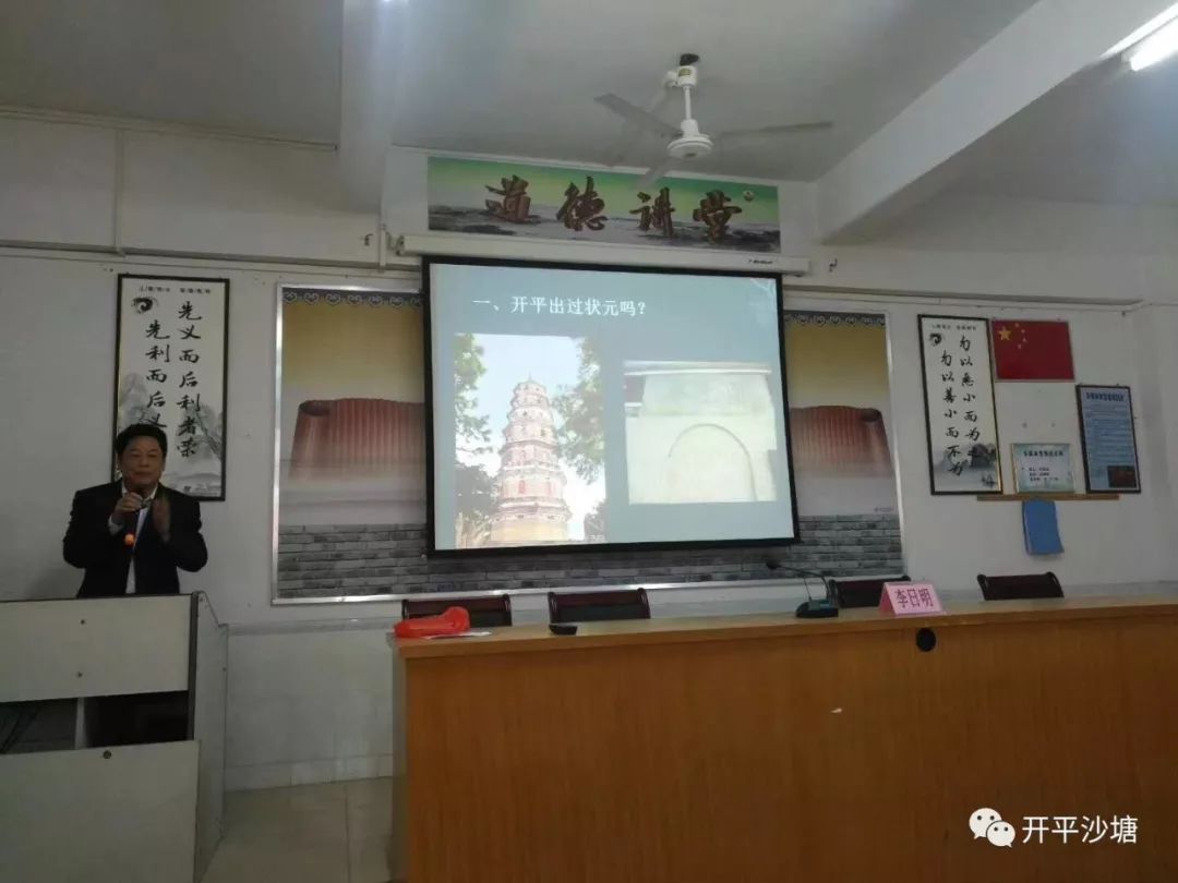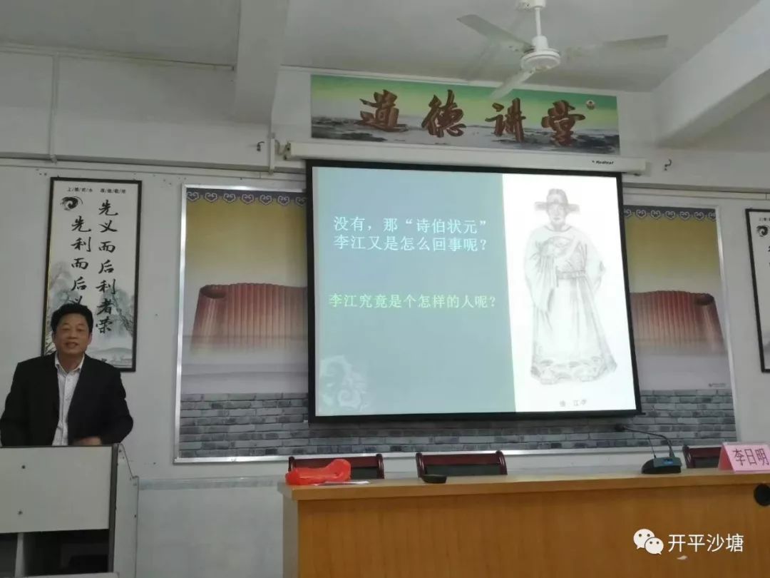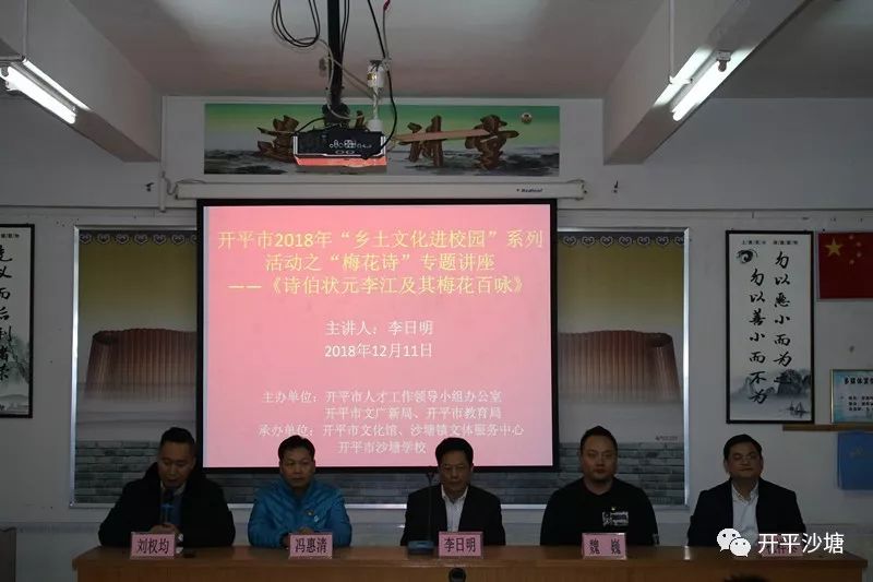 2018年12月11日,由开平市人才工作领导小组办公室、开平市文广新局和开平市教育局主办,开平市文化馆、沙塘镇文体服务中心及开平市沙塘学校承办的“乡土文化进校园”--《诗伯状元李江及其梅花百咏》专题讲座于沙塘学校多媒体室举行。讲座吸引了210多名师生前来参加,开平市文化馆魏巍馆长、沙塘镇冯惠清副镇长出席了本次活动。