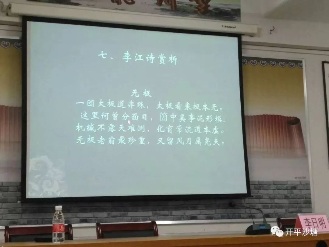 主讲人原开平市文联主席、潭江诗社社长李日明先生。他风趣幽默地向全体师生讲述沙塘丽洞明朝诗人李江的故事,还与师生们共同分享了李江《梅花百咏》中的精彩的诗句。