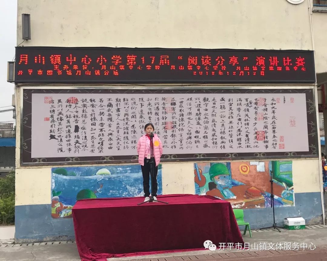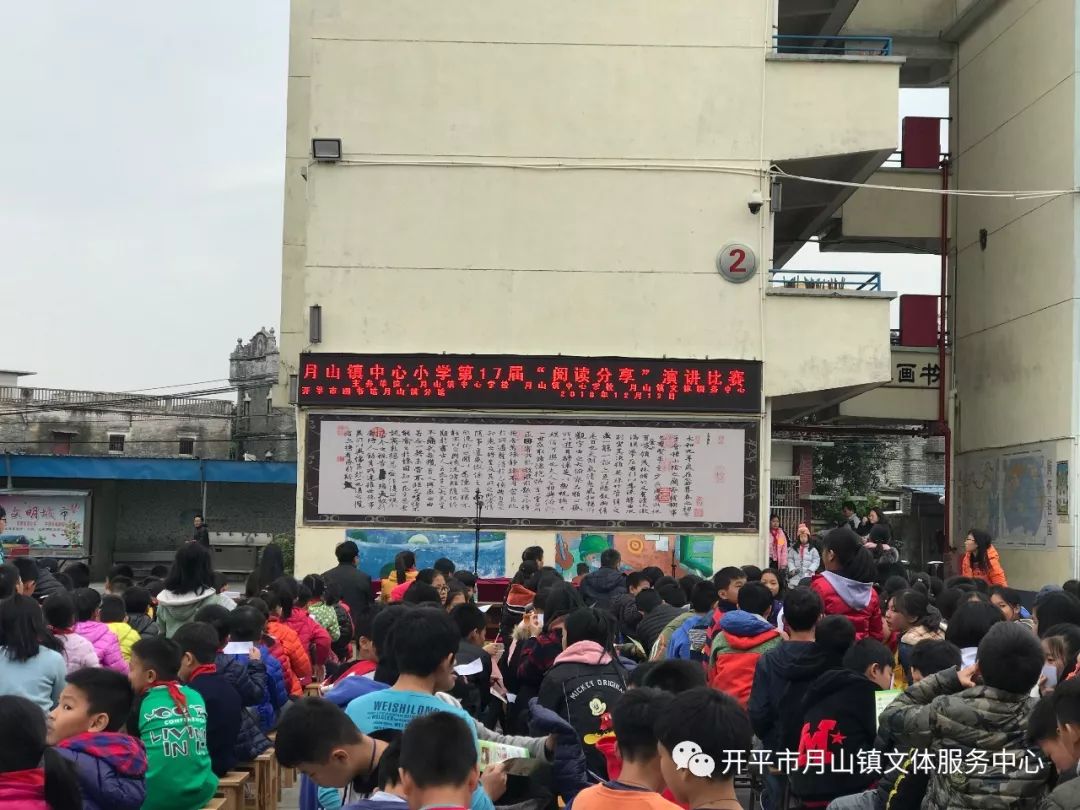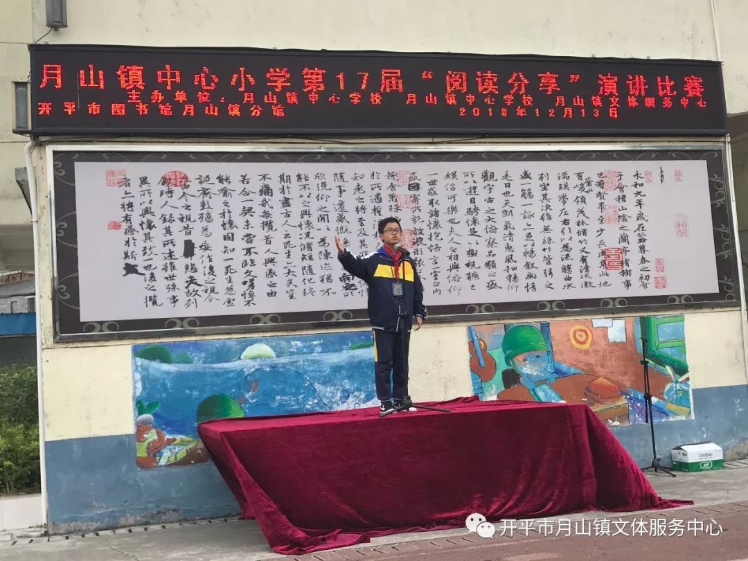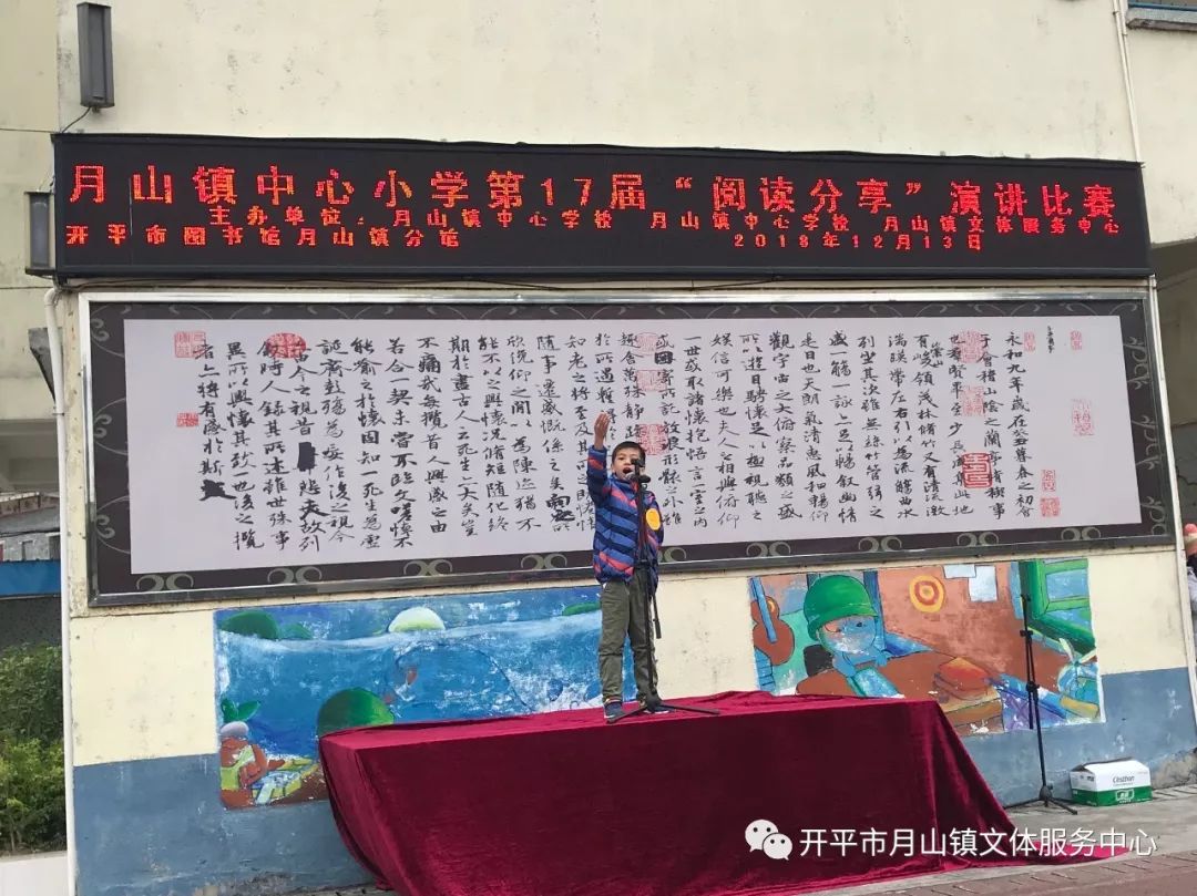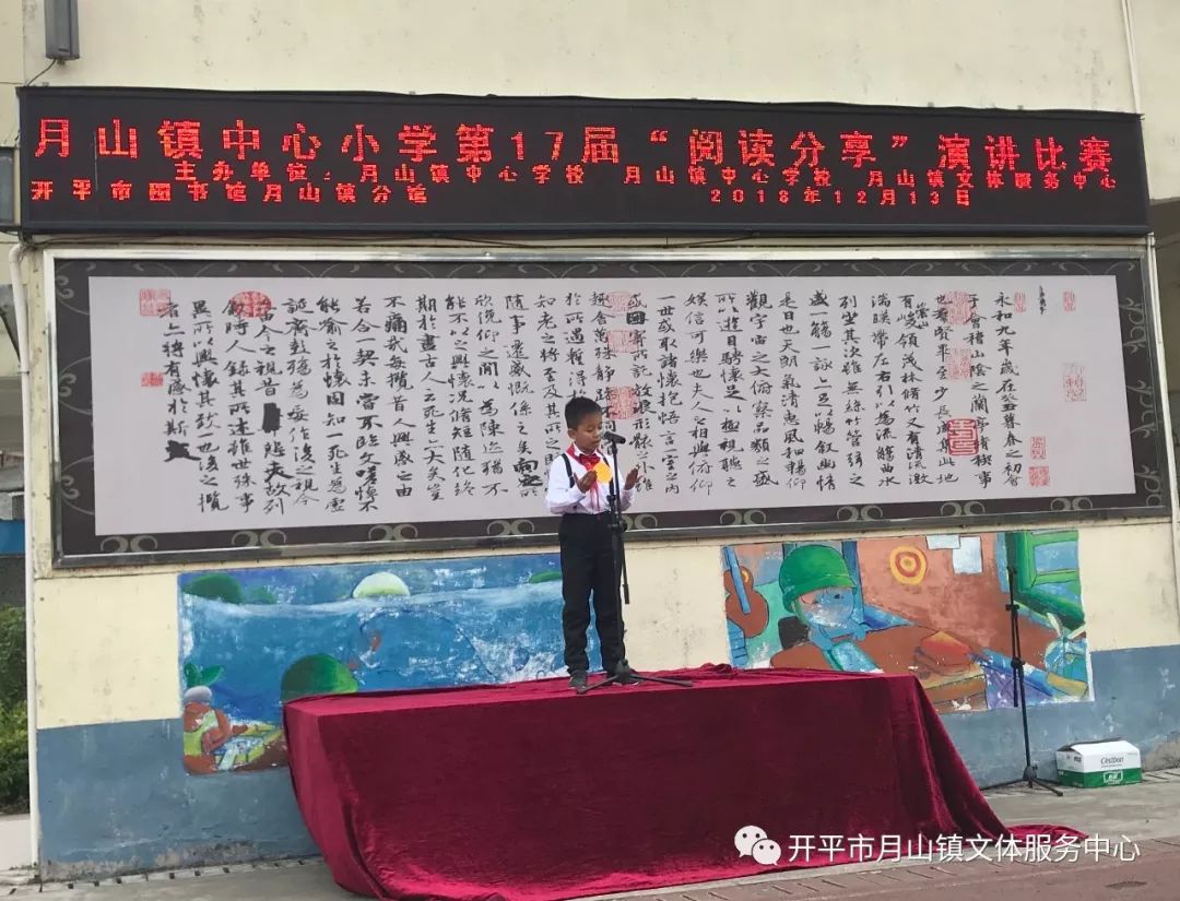 为了弘扬中华民族优秀文化、传承中华文明,为丰富月山镇中心小学学生的精神文化生活,营造书香校园的氛围,提高学生对阅读的兴趣,形成多读书、读好书的良好习惯,激发学生读书热情,并锻炼孩子们的演讲能力,发展学生思维能力,月山镇文体服务中心、开平市图书馆月山分管联合月山镇中心小学举行第十七届“分享阅读”主题演讲比赛决赛。这次活动通过班预选赛、同级初赛,最后每个年级分别选出一名参赛选手参加12月13日下午在月山镇中心小学篮球场举行了第十七届“阅读分享”主题演讲比赛决赛。学校全体师生参加了这次演讲活动。
