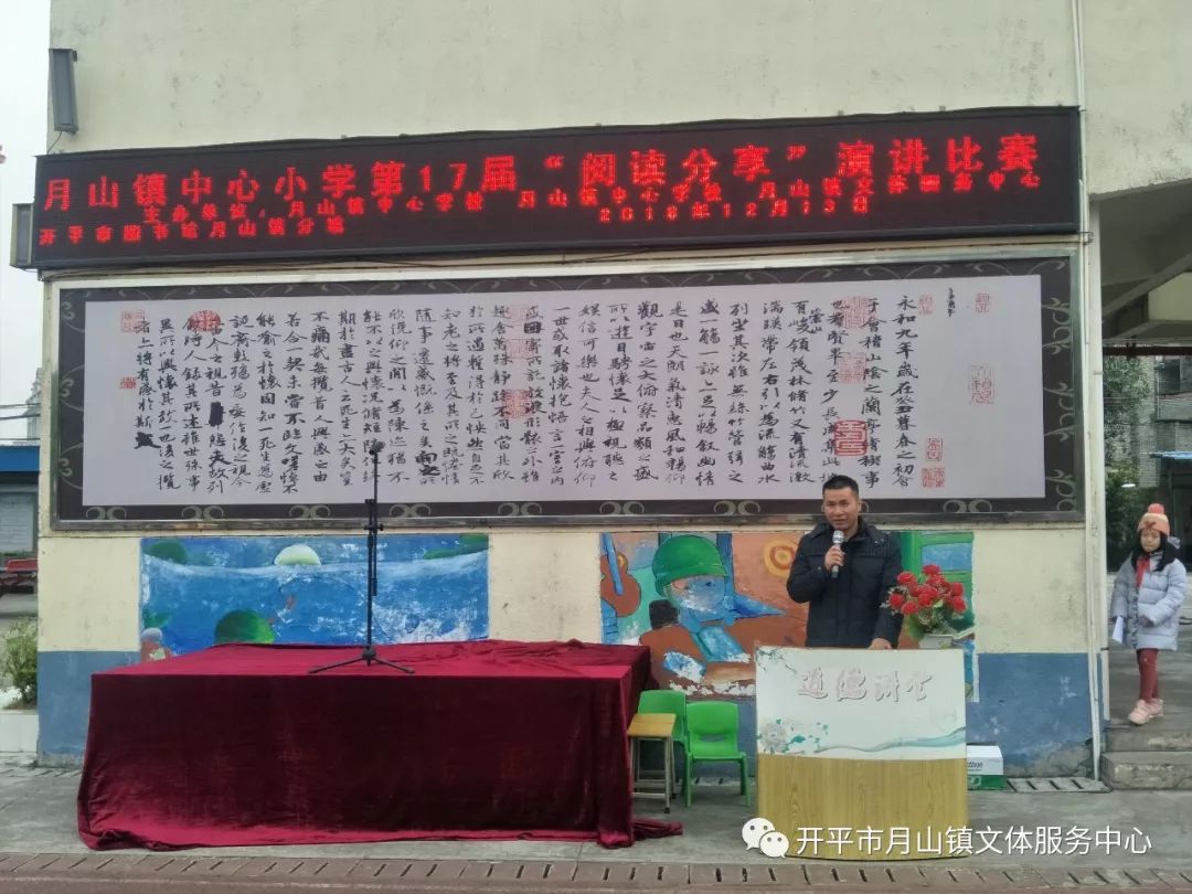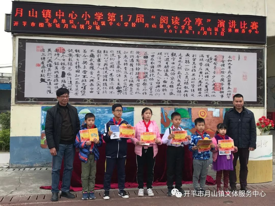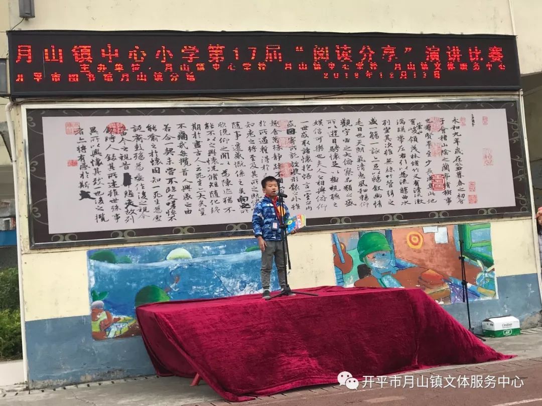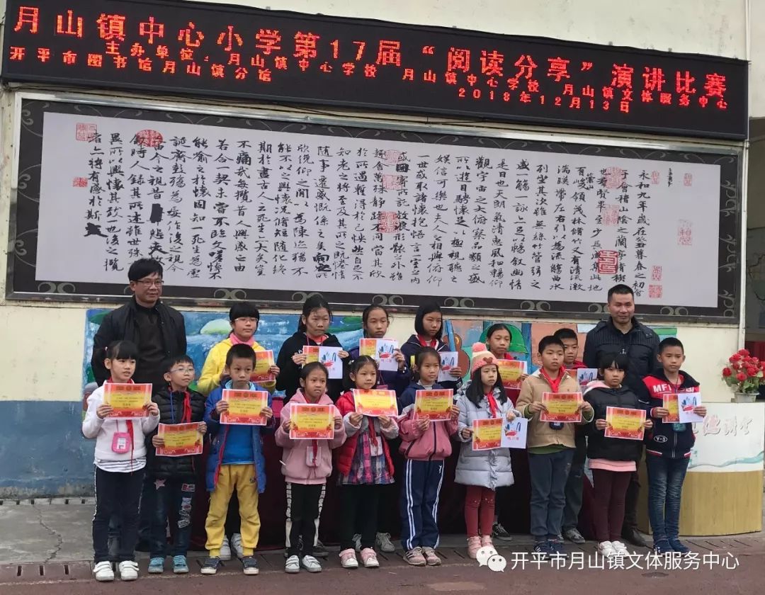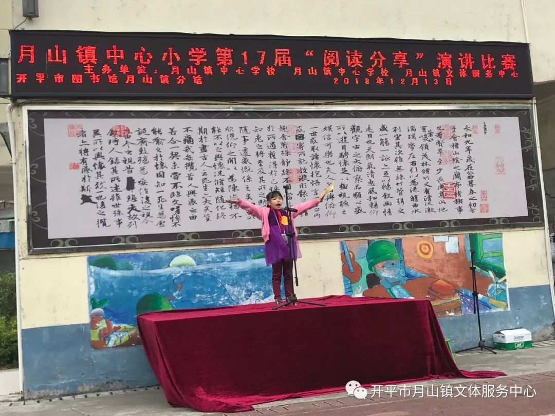 为了弘扬中华民族优秀文化、传承中华文明,为丰富月山镇中心小学学生的精神文化生活,营造书香校园的氛围,提高学生对阅读的兴趣,形成多读书、读好书的良好习惯,激发学生读书热情,并锻炼孩子们的演讲能力,发展学生思维能力,月山镇文体服务中心、开平市图书馆月山分管联合月山镇中心小学举行第十七届“分享阅读”主题演讲比赛决赛。这次活动通过班预选赛、同级初赛,最后每个年级分别选出一名参赛选手参加12月13日下午在月山镇中心小学篮球场举行了第十七届“阅读分享”主题演讲比赛决赛。学校全体师生参加了这次演讲活动。