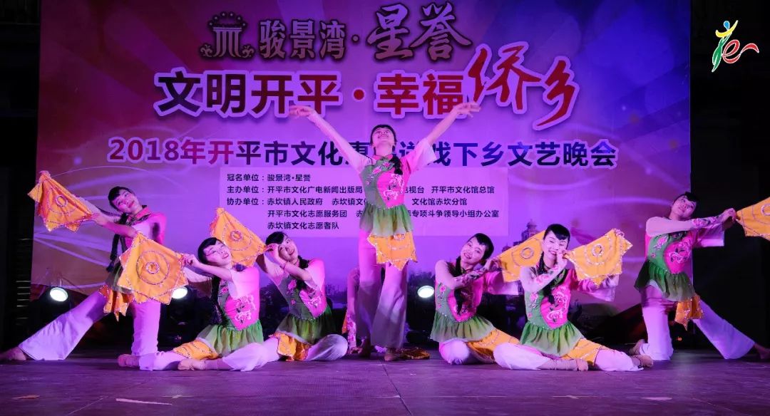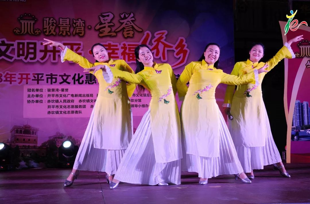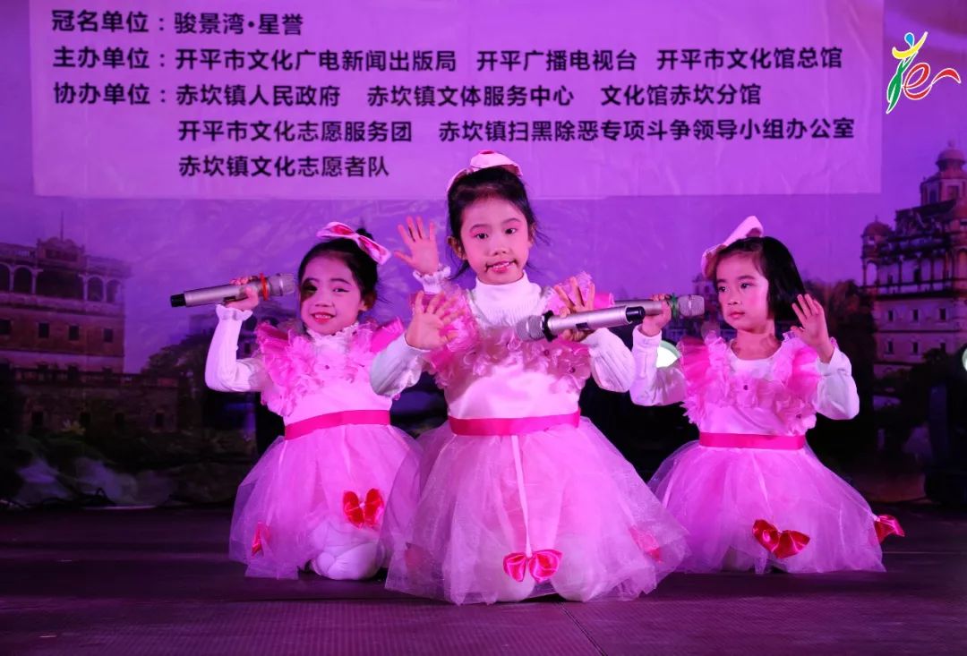 晚会以舞蹈《蝴蝶飞》拉开序幕,共11个节目,有专业的文化志愿参与演出的节目开平民歌表演唱《地灵人杰颂开平》、童声小组唱《雪娃娃》、《童声嘹亮》、器乐独奏《新鸳鸯蝴蝶梦》、粤曲对唱《绝情谷底侠侣情》、开平市民歌表演唱《绣碉楼》,开平民歌《扫黑除恶保平安》、舞蹈《相逢春天》,也有赤坎镇中英文幼儿园的舞蹈《咚巴拉》、《幸福山歌》,赤坎镇群众参与的舞蹈《茶香中国》。